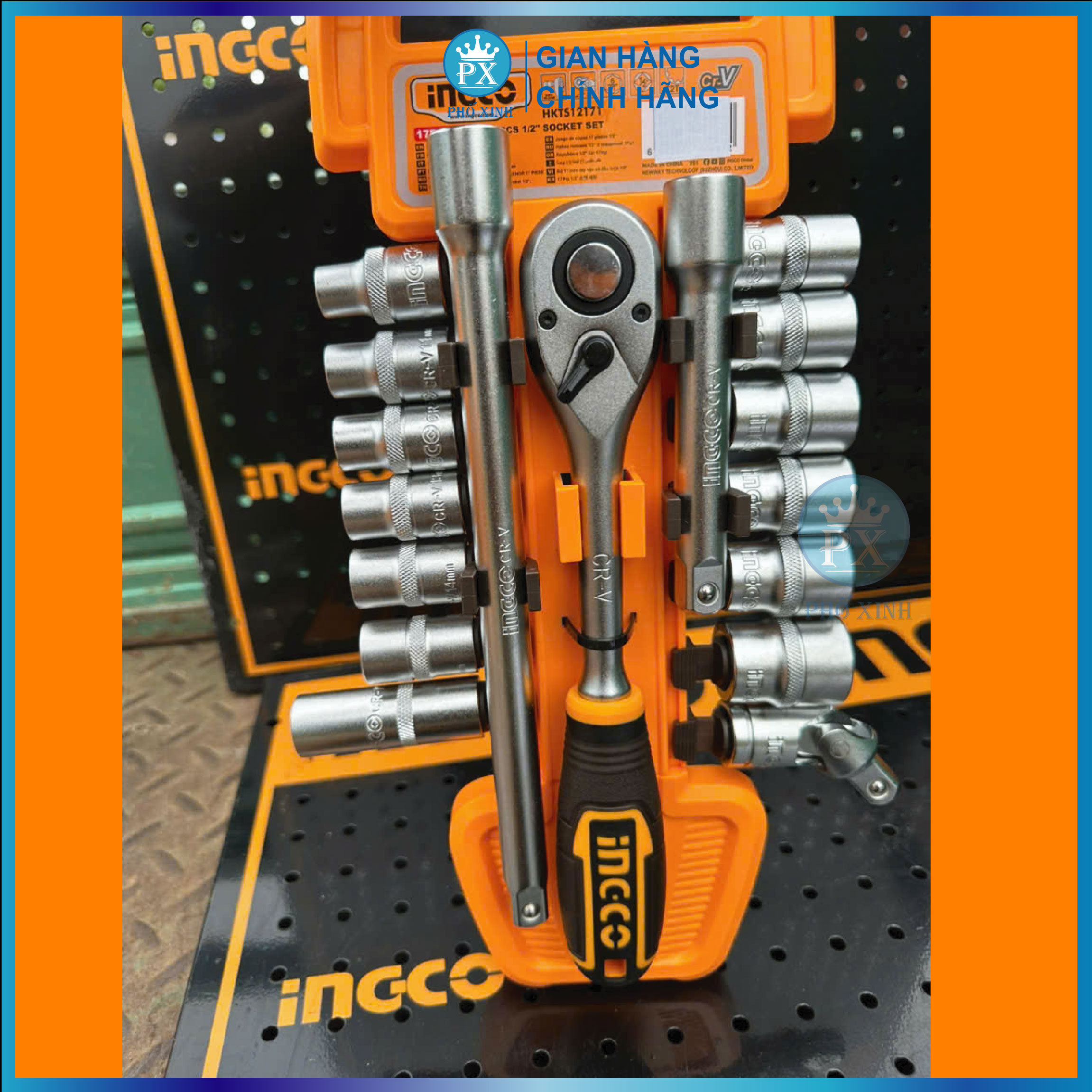 Bộ 17 ổ cắm 1/2" Bao gồm: 12 ổ cắm Dr 1/2": 10-11-12-13-14-15-16-17-18-19-21-24mm 1 tay cầm ratchet tháo lắp nhanh 1/2" 72T 2 thanh nối dài Dr 1/2": 5"(125mm) & 10"(250mm) 1 ổ cắm bugi:
