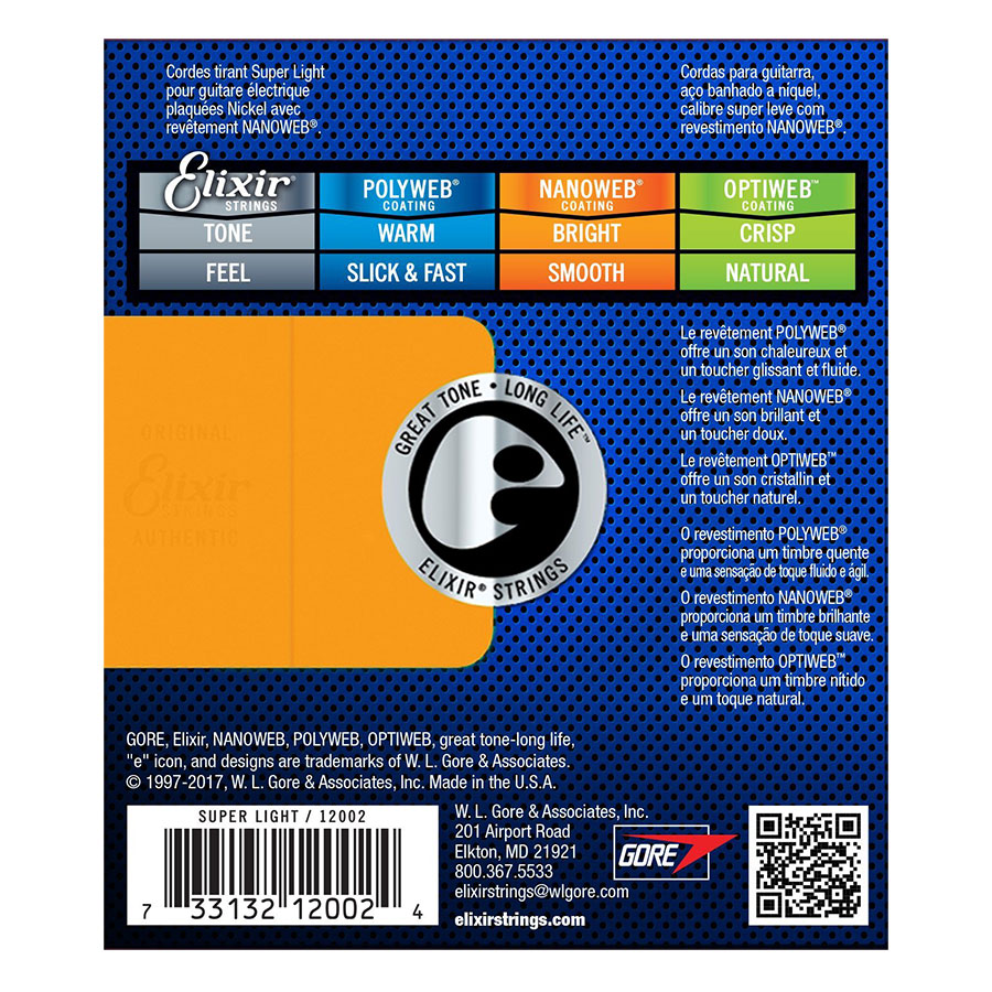 - Bộ Dây Đàn Guitar Electric Elixir 12002 được làm bằng dây thép bọc niken, phủ Nanoweb rất mỏng khiến người chơi thấy giống như đang chơi dây thông thường, tạo sự thoải mái khi sử dụng.