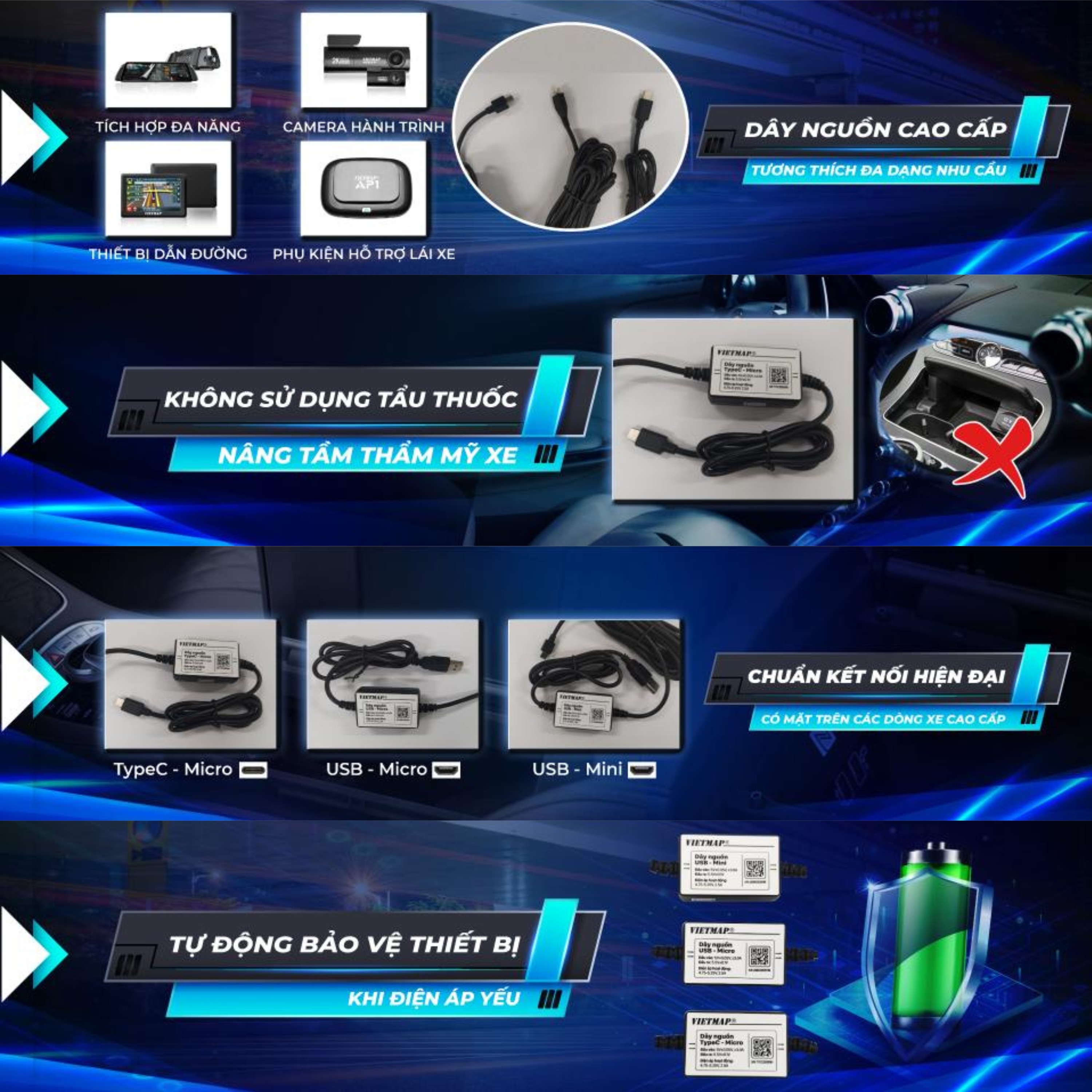 Giải Pháp Dây Ng.uồn Cao Cấp VIETMAP với chuẩn kết nối hiện đại tương thích mọi dòng xe cao cấp, thiết kế nhỏ gọn dễ dàng lắp đặt, không cần sử dụng tẩ.u th.uốc, dễ dàng giấu kín giúp nội thất xe trở nên gọn gàng và nâng cao tính thẩm mỹ không gian trong xe.