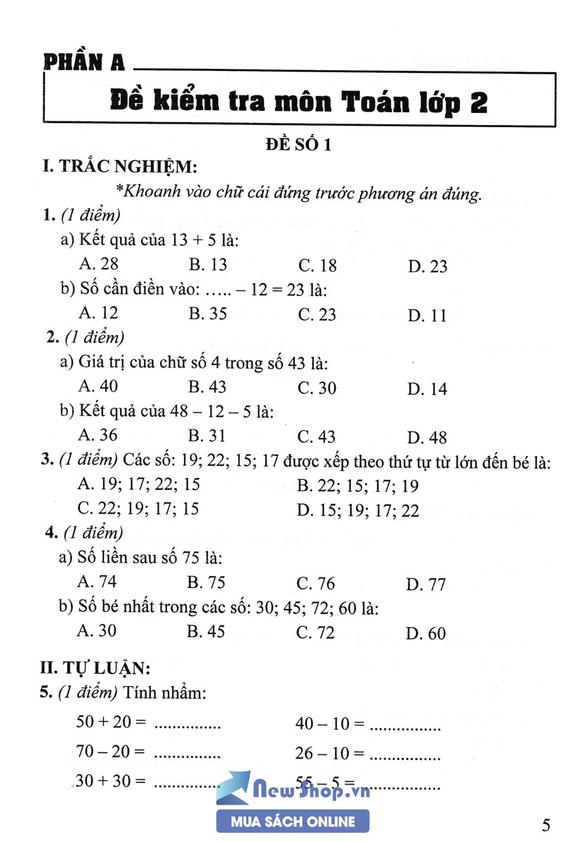 Bộ Đề Kiểm Tra Môn Toán Lớp 2 (Theo Chương Trình Giáo Dục Phổ Thông Mới - Bám Sát SGK Kết Nối Tri Thức Với Cuộc Sống) Từ năm học 2021-2022, các em học sinh lớp 2 được học sách giáo khoa theo Chương Trình Giáo Dục Phổ Thông Mới. Mục tiêu của chương trình mới là phát triển năng lực, phẩm chất của học sinh. Do vậy, nhằm hỗ trợ quý thầy cô và các bậc phụ huynh có thêm tài liệu hướng dẫn các em học sinh học tốt môn Toán lớp 2,chúng tôi đã tổ chức biên soạn cuốn sách. Cuốn sách gồm 2 phần chính: Phần A: Đề kiểm tra môn toán lớp 2 Phần B: Gợi ý tham khảo Hi vọng rằng cuốn sách sẽ là tài liệu tham khảo hữu ích đối với giáo viên và học sinh lớp 2 .
