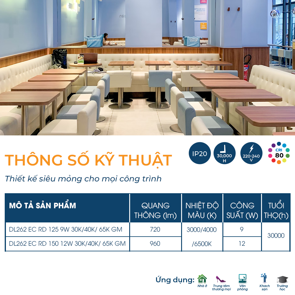 Đường kính khoét lỗ / Công suất: 90/7W. Dải điện áp hoạt động: (150V - 250V)/50Hz Quang thông: 500lm/470lm Nhiệt độ màu: Sáng trắng 6500K/ Sáng vàng 3000K Kích thước (ØxH): (118x40)mm ĐK lỗ khoét