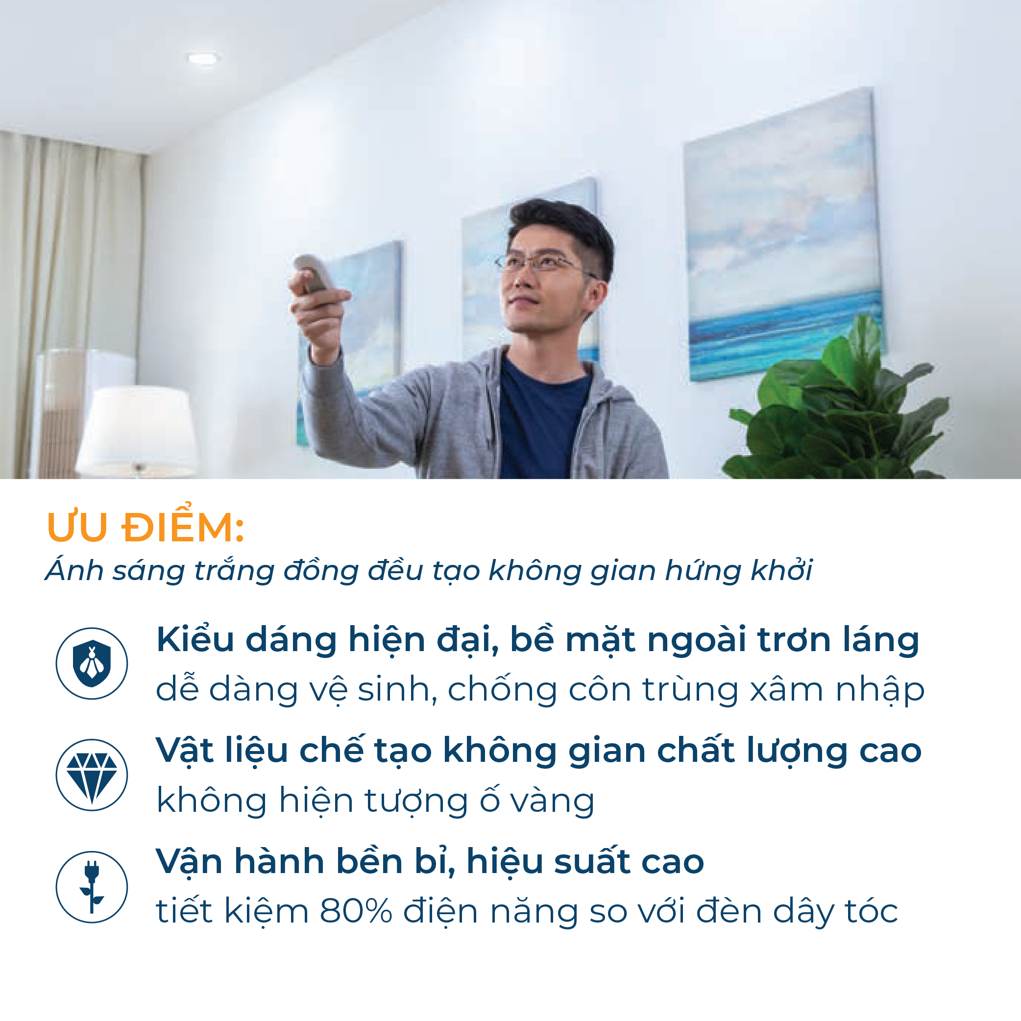 Màu vàng ấm tạo cảm giác ấm cúng Màu trắng lạnh tạo cảm giác mát mẻ, tỉnh táo Sử dụng Chip LED có độ tin cậy cao Chất lượng ánh sáng cao (CRI> 80) tăng