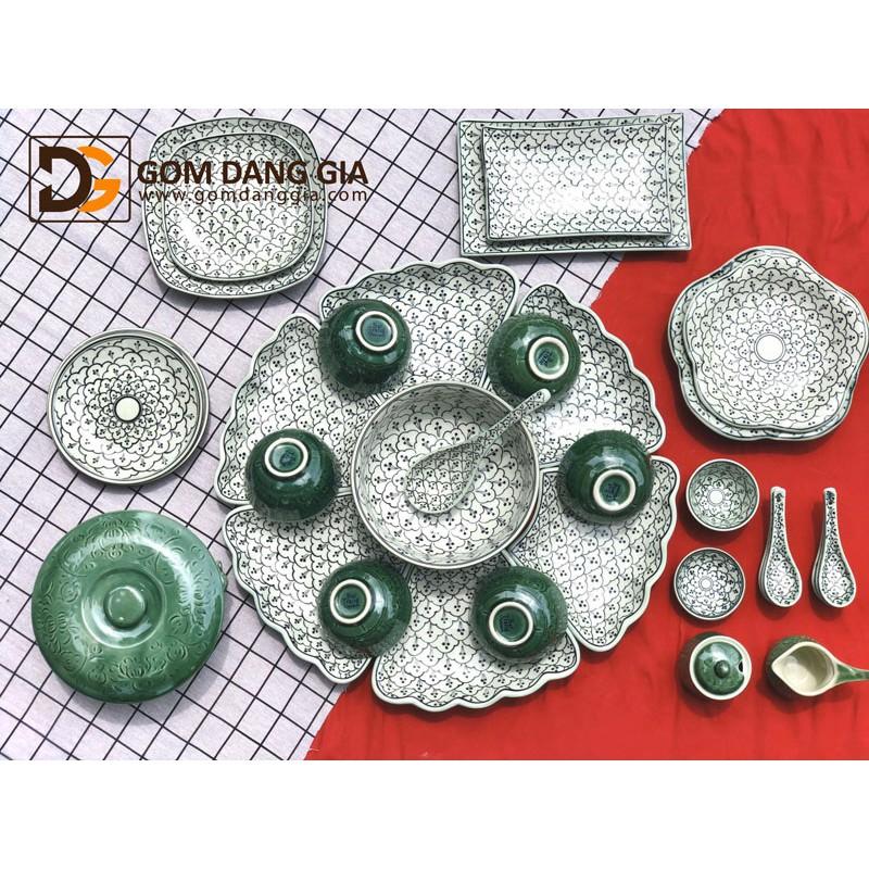 Bộ đồ ăn mặt trời + phụ kiện Bát Tràng vẽ tay khắc hoa men lục bảo S6 Gốm sứ gia dụng - bộ đồ ăn truyền thống Thương hiệu - Bát Tràng. Chất liệu: