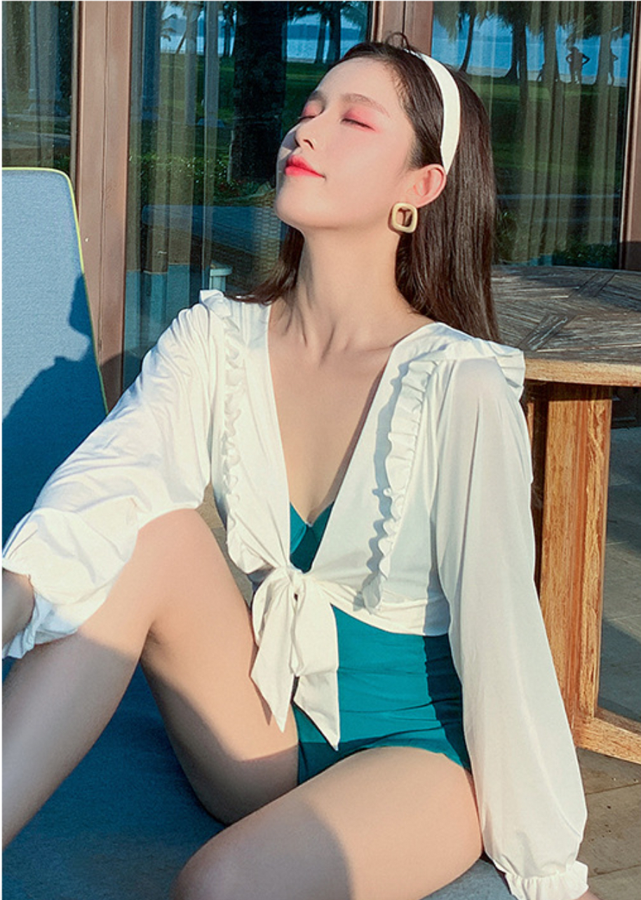 ✨Bộ đồ bơi bikini nữ 1 mảnh giấu bụng tôn dáng đi tắm biển kèm áo ren trắng khoác ngoài chống nắng - B. 04