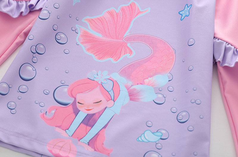 Đồ bơi bé gái thiết kế dáng váy phối hoạ tiết nàng tiên cá, áo tay ngắn zắc lăng vừa vặn vai bé giúp bé dễ dàng vận động cùng chân váy dáng xòe duyên