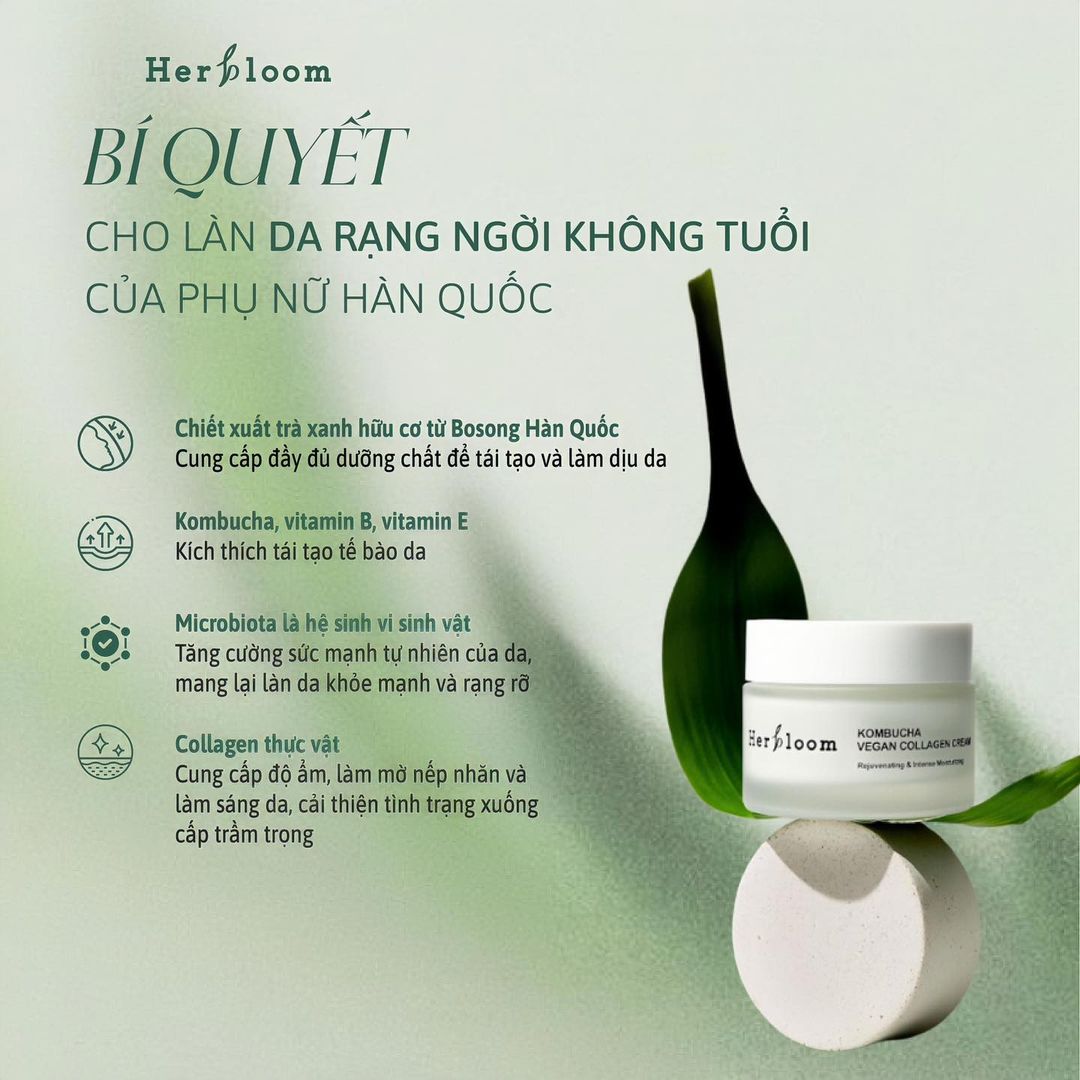 Kem Collagen Thuần Chay Herbloom Kombucha 50ml Hàn Quốc là Sản phẩm thuần chay 100% nguyên liệu đạt chứng nhận EVG an toàn. Thông tin sản phẩm: Sản phẩm mang lại vẻ đẹp khỏe mạnh