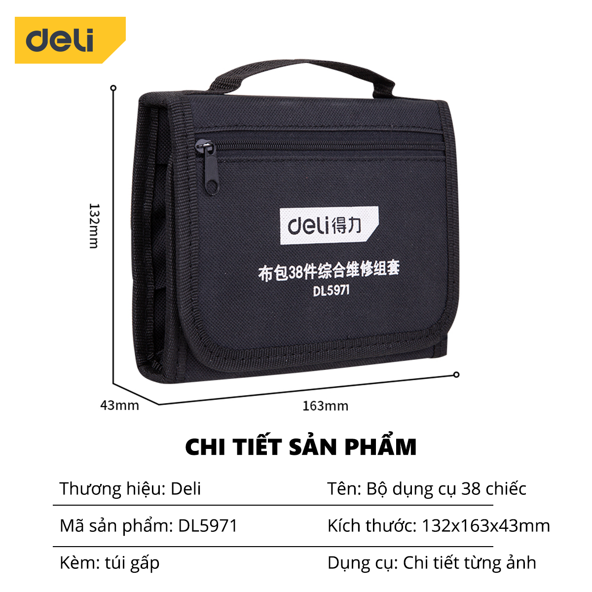 DELI TOOLS OFFICIAL STORETHÔNG TIN SẢN PHẨM:- Hãng sản xuất: Deli- Mã sản phẩm: DL5971- Bộ dụng cụ 38 chi tiết sử dụng đa mục đích- Túi vải gọn gàng, tiện lợi, dễ dàng di chuyển.BỘ DỤNG CỤ 38 CHI TIẾ...