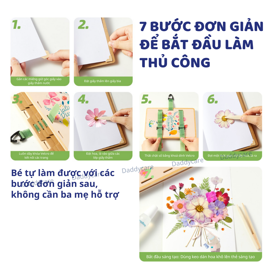 - THIẾT KẾ DẠNG CUỐN SỔ DỄ SỬ DỤNG Tấm gỗ, giấy bìa và giấy thấm có thể được kết nối với nhau bằng dây khoá Velcro để tạo thành dạng cuốn sổ. Bé dễ dàng thao tác lật giở giữa các trang hay ép hoa lá.