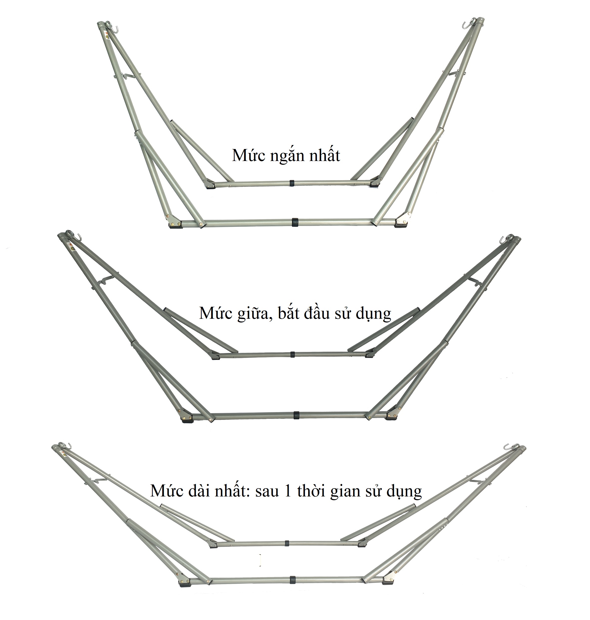 Khung võng xếp bằng ống thép: sơn tĩnh điện, đường kính 27.0mm, chiều dày 0.9mm, 4 thanh chống cong:điều chỉnh độ dài & độ cao của khung võng. Kích thước sử dụng: trung bình 210