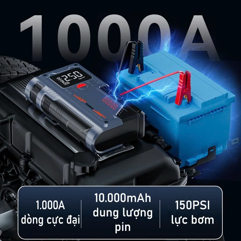 ✨Bộ Kích Bình Ắc Quy 12V 1000A Kiêm Bơm Lốp Xe 150Psi 10000 mAh Dùng Cho Xe 4C Đến 7C
