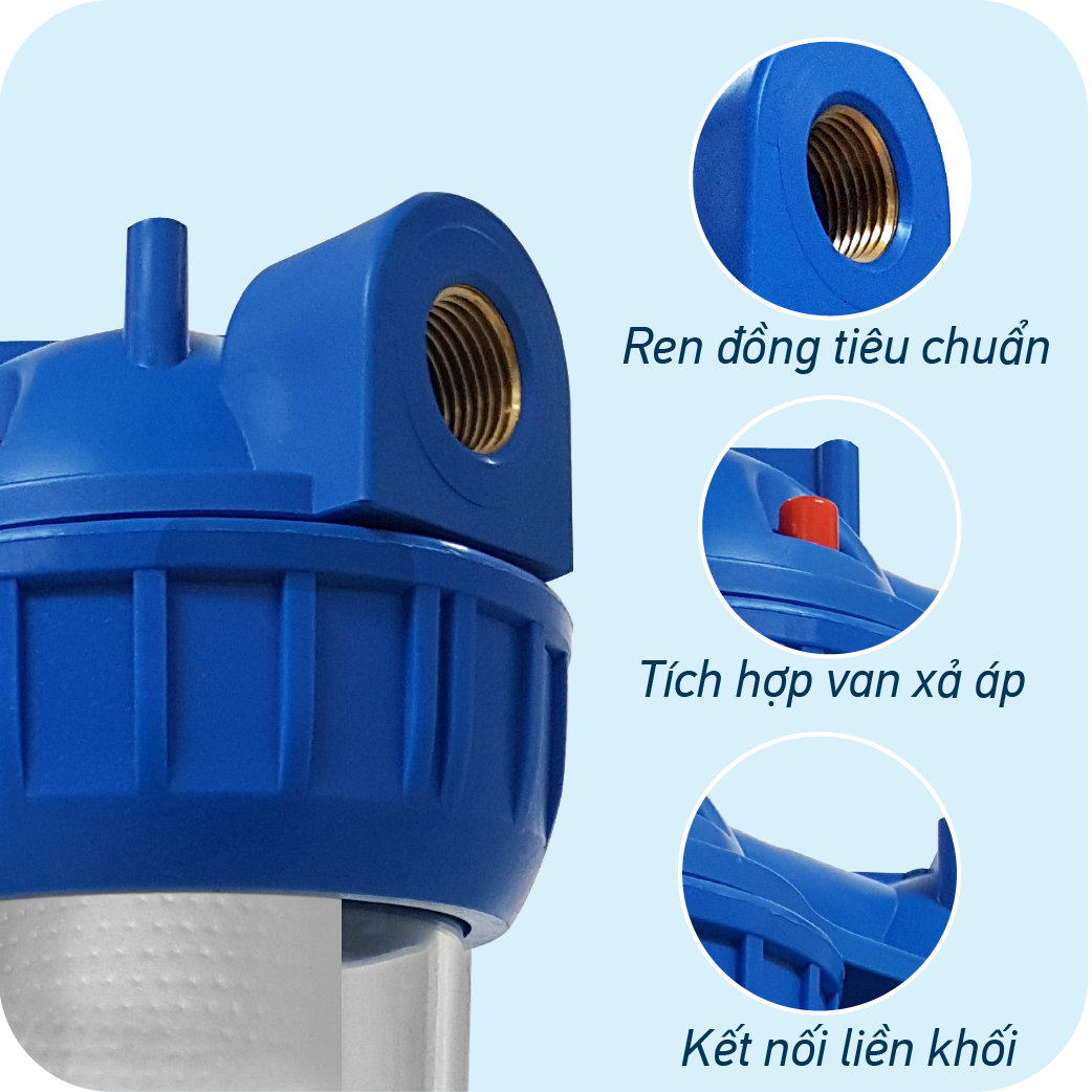 - Ren đồng tiêu chuẩn phù hợp với với tiêu chuẩn quốc tế. - Van xả áp tích hợp dễ dàng hơn cho việc thay thế lõi lọc.