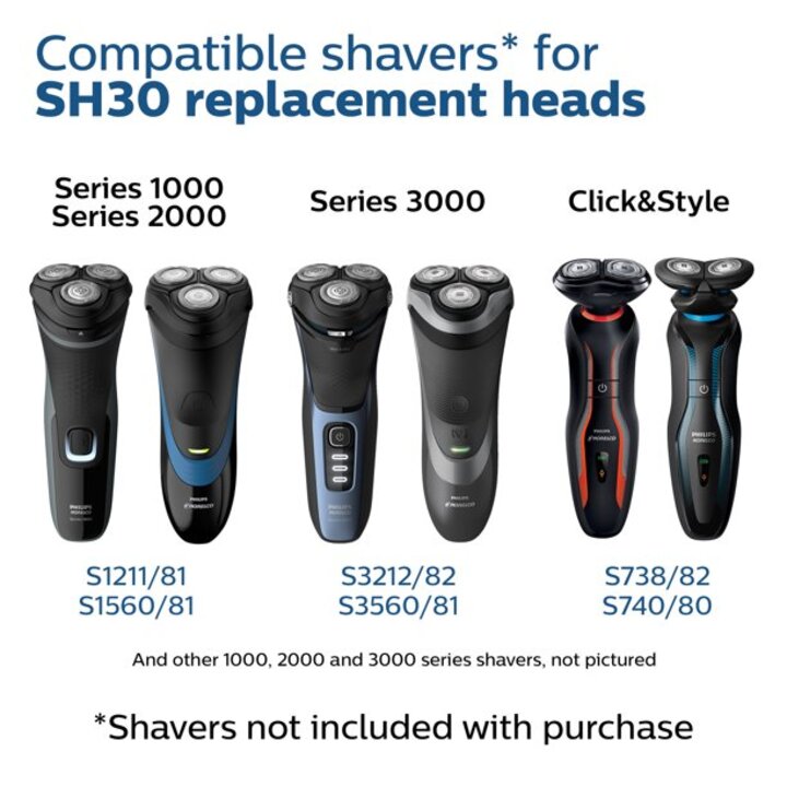 - Đầu thay thế SH30 tương thích với các dòng Máy cạo râu Serial 1000 (S1xxx), 2000 (S2xxx) và 3000 (S3xxx)