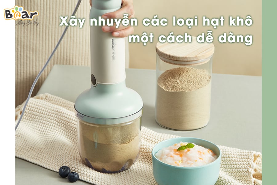 - Hướng dẫn sử dụng bộ máy xay cầm tay đa năng Bear JBQ-B50E1 Bước 1: Cắt thực phẩm thành hình vuông vừa vặn, cho vào cối và thêm nước vừa đủ. Bước 2: Giữ cụm dao với thân cố định, điều chỉnh núm tốc độ cho phù hợp. Bước 3: Cắm dây điện. Bước 4: Giữ một tay vào thân máy và đặt bộ dao vào cối đựng trái cây, giữ chắc tay và tiến hành xay. Bước 5: Rút phích cắm sau khi sử dụng xong. Bước 6: Sau khi lưỡi dao ngừng quay, tháo thân máy đầu tiên, sau đó xoay ngược chiều kim đồng hồ, để mở cối xay và đổ thực phẩm ra khỏi cối.