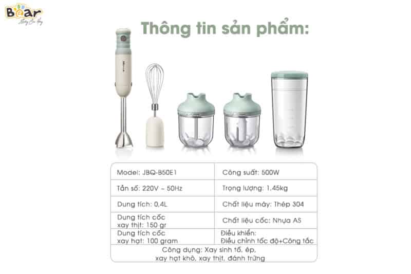 - Phụ kiện của máy xay sinh tố đa năng Bear BL-B35V1 Bộ máy xay cầm tay đa năng Bear JBQ-B50E1 có bộ phụ kiện bao gồm 1 thân máy tích hợp dây cắm, 1 bộ nối que đánh trứng, 1 que đánh trứng, 1 cối đựng nước hoa quả, 1 nắp cối xay thịt, 1 nắp cối đựng nước hoa quả, 1 lưỡi dao, 1 cối xay và sách hướng dẫn tiếng Việt.