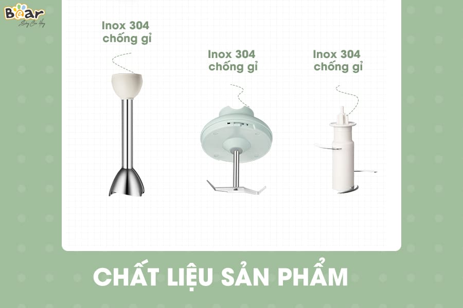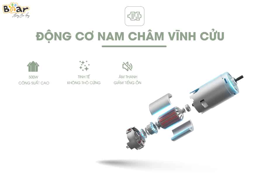 - Điểm nổi bật ở bộ máy xay cầm tay đa năng Bear JBQ-B50E1 Khả năng đánh trứng siêu đẳng Bộ máy xay cầm tay đa năng Bear JBQ-B50E1 có thiết kế mới nổi bật với đầu đánh trứng đi kèm, giúp bạn có thể tận dụng chiếc máy xay để trở thành chiếc máy đánh trứng hiện đại. Thiết kế thông minh, sử dụng dễ dàng Các chuyên gia đã nghiên cứu cho ra một thiết bị tối tân với thiết kế thông minh, có thể tháo rời, thay đầu cắt linh hoạt, góp phần đưa sản phẩm thành một trong những thiết bị đa năng. Ngoài ra, bộ máy xay cầm tay đa năng Bear JBQ-B50E1 còn cực kỳ dễ dùng. Chỉ thông qua một chiếc núm xoay đơn giản là bạn đã có thể điều chỉnh tốc độ xoay theo ý muốn cho từng mục đích sử dụng. Động cơ nam châm vĩnh cửu, chất liệu bền bỉ Bộ máy xay cầm tay đa năng Bear JBQ-B50E1 có công suất hoạt động cực cao 500W nhưng lại không gây ra tiếng ồn quá to. Vì bộ máy được trang bị động cơ nam châm vĩnh cửu cùng với chất liệu hiện đại inox không gỉ, giúp cho thiết bị luôn sáng mới và lâu bền.