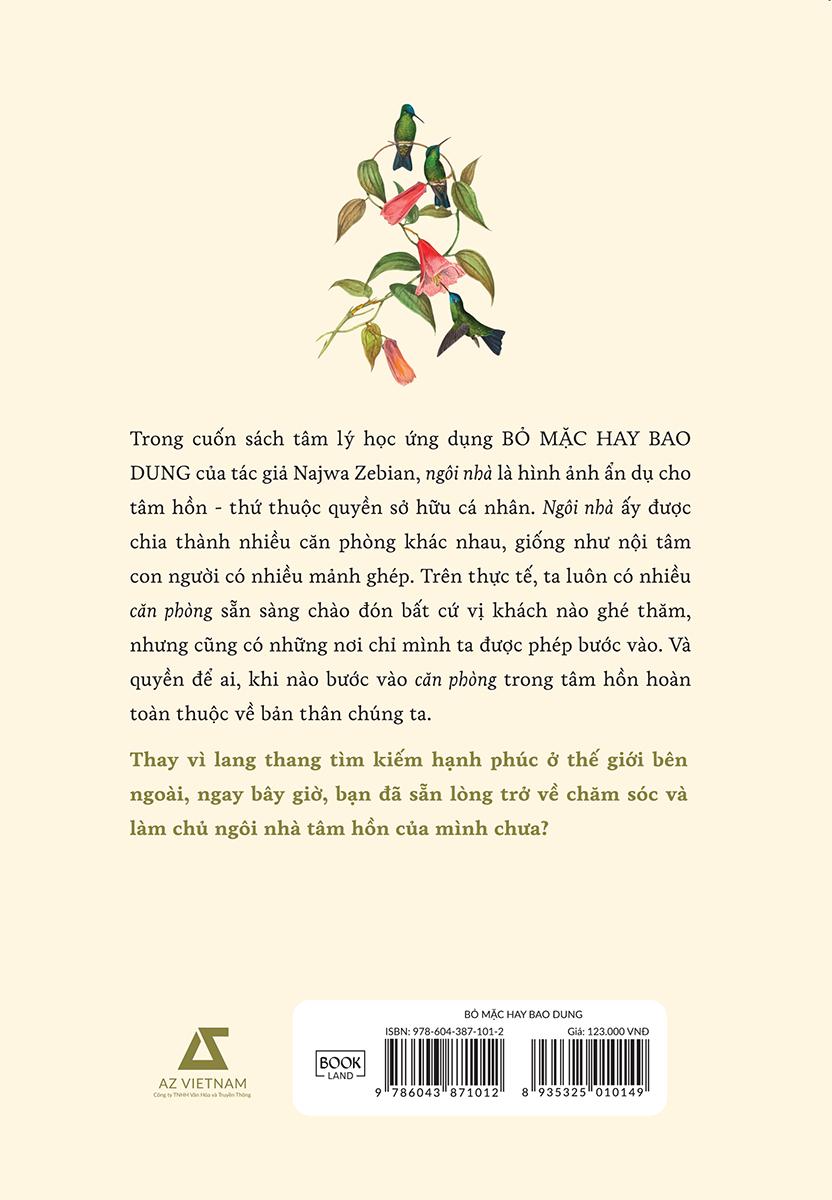 Trong cuốn sách tâm lý học ứng dụng BỎ MẶC HAY BAO DUNG của tác giả Najwa Zebian, “ngôi nhà” là hình ảnh ẩn dụ cho tâm hồn - thứ thuộc quyền sở hữu cá nhân. Ngôi nhà ấy được chia thành nhiều căn phòng khác nhau, giống như nội tâm con người có nhiều mảnh ghép. Trên thực tế, ta luôn có nhiều căn phòng sẵn sàng chào đón bất cứ vị khách nào ghé thăm, nhưng cũng có những nơi chỉ mình ta được phép bước vào. Và quyền để ai, khi nào bước vào căn phòng trong tâm hồn hoàn toàn thuộc về bản thân chúng ta.