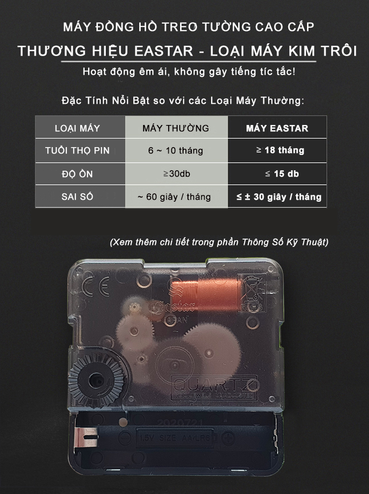 1. ĐẶC ĐIỂM NỔI BẬT: - Máy đồng hồ Treo tường Eastar Kim trôi Độ chính xác cao (≤± 30 giây/tháng), hoạt động ổn định, chính xác, êm ái, không gây bất kỳ tiếng tíc