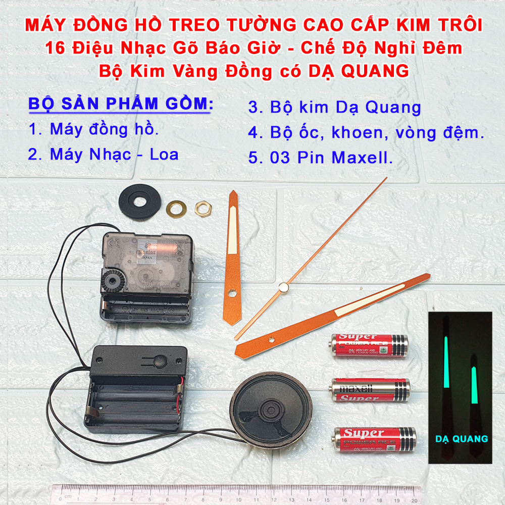Máy Nhạc + Loa, Máy Đồng hồ Kim trôi, Bộ kim Dạ Quang, Bộ Ốc và Vòng khoen, 03 pin tiểu AA, Hộp đựng, Hướng dẫn tháo lắp Máy đồng hồ và Phiếu Bảo hành.