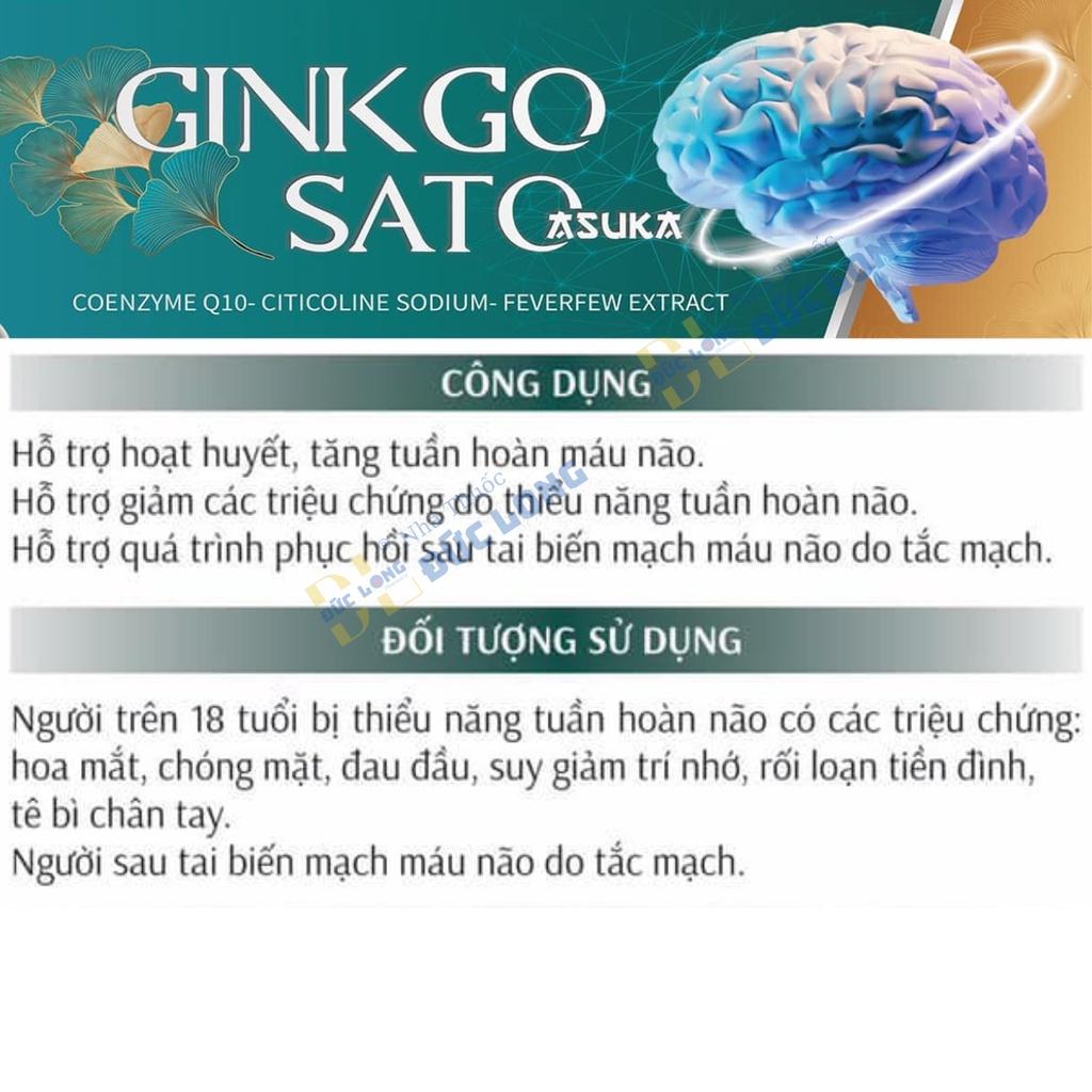 Bổ não Ginkgosato asuka pharma, viên uống bổ não, tuần hoàn máu não, Hộp 2 lọ x 30 viên – Đức Long CÔNG DỤNG: • Hỗ trợ hoạt huyết, tăng tuần hoàn máu não. •