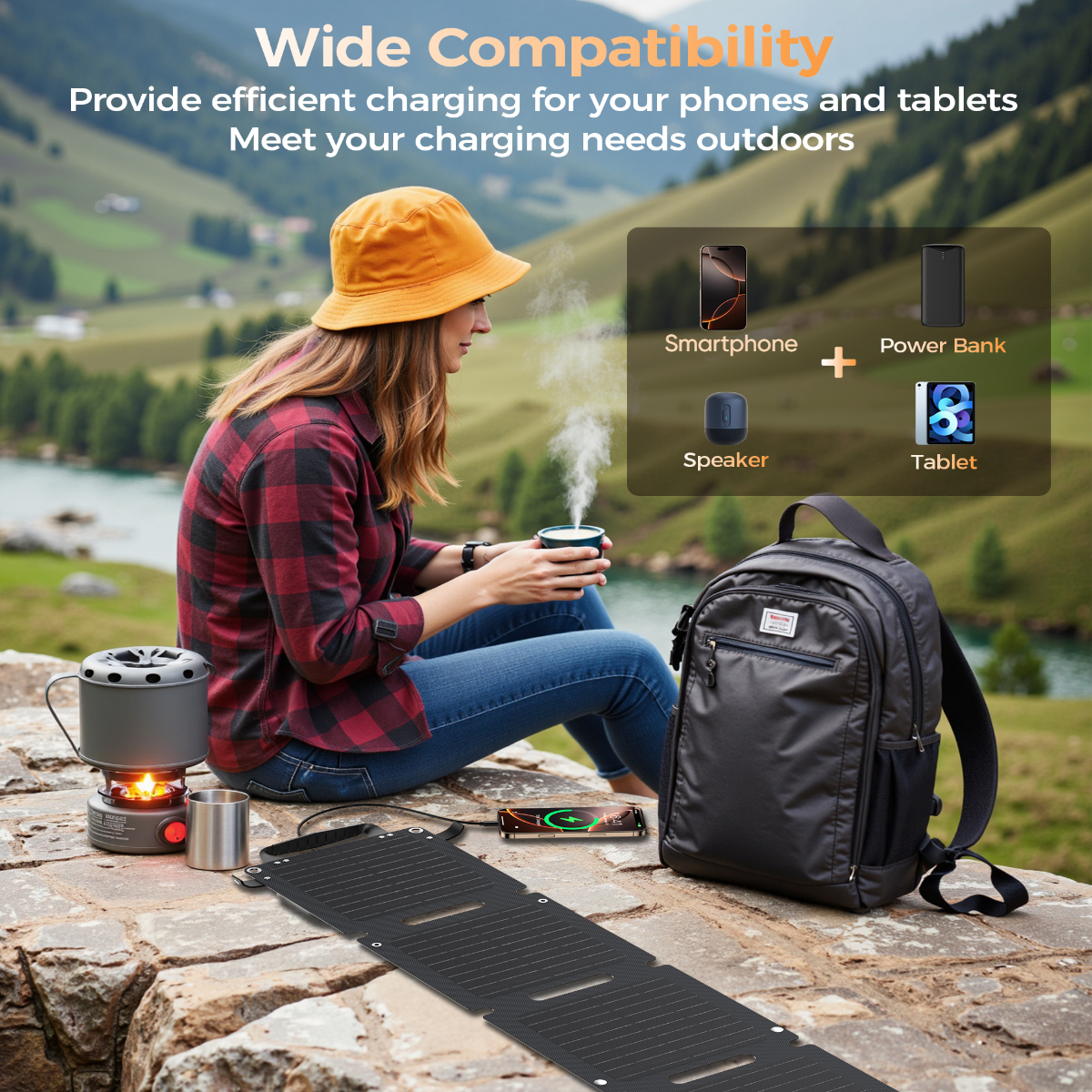 - Đóng gói:1 hộp 1 sản phẩm và sách hướng dẫn sử dụng – Bạn là người đam mê du lịch, phượt hoặc thường xuyên làm việc ngoài trời? Bộ sạc năng lượng mặt trời di động Choetech SC005-V5 chính là giải pháp lý tưởng giúp bạn duy trì kết nối ở bất kỳ đâu, bất kể không có nguồn điện truyền thống. – Choetech SC005-V5 sở hữu thiết kế thông minh với khả năng gấp gọn tiện lợi, dễ dàng bỏ vào balo, túi xách hay treo lên balo trong những chuyến đi dài. Chất liệu bền bỉ, chống chịu tốt với thời tiết, giúp bạn yên tâm sử dụng ngoài trời. – Được trang bị 4 tấm pin năng lượng mặt trời chất lượng cao, thiết bị cho khả năng chuyển đổi năng lượng hiệu quả, cung cấp công suất sạc lên đến 28W, đủ để sạc điện thoại, máy tính bảng, tai nghe, pin dự phòng và các thiết bị USB khác. – Với 2 cổng tiện lợi, có thể sạc được 2 thiết bị cùng lúc vô cùng tiết kiệm thời gian và tăng hiệu quả sử dụng trong mọi tình huống: