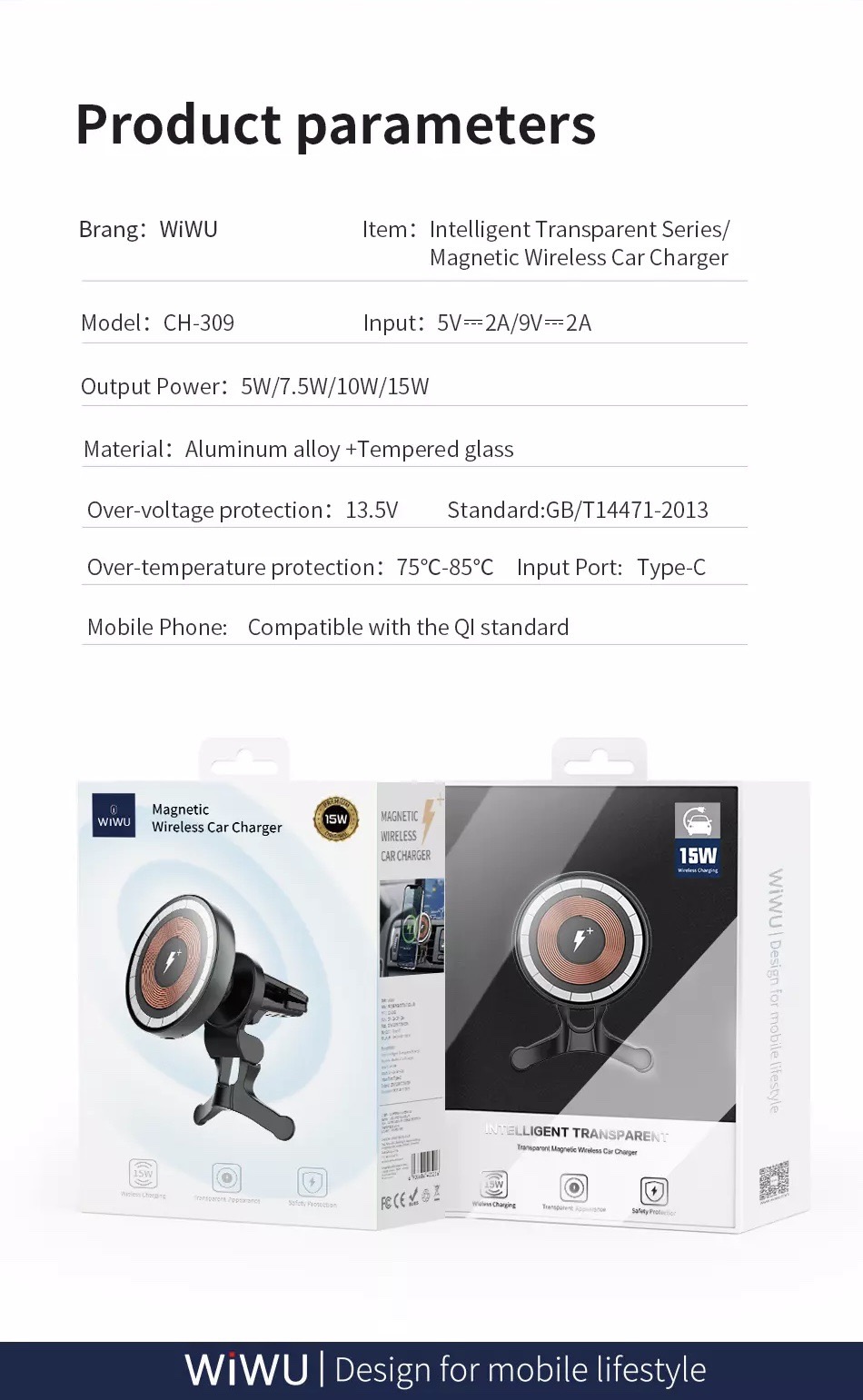 Giá đỡ điện thoại trên ô tô WiWU CH-309 tích hợp sạc không dây từ tính trong suốt công suất 15W