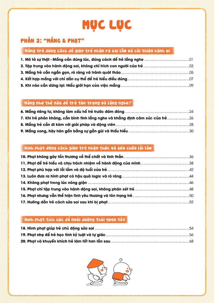 - Cấu trúc khoa học, dễ áp dụng : Sách chia thành các phần Khen – Mắng – Phạt rõ ràng, mỗi phần có các nguyên tắc hướng dẫn cụ thể. Không chỉ trích, không bạo lực: Dạy cách mắng và phạt con một cách tích cực, không gây tổn thương tinh thần.