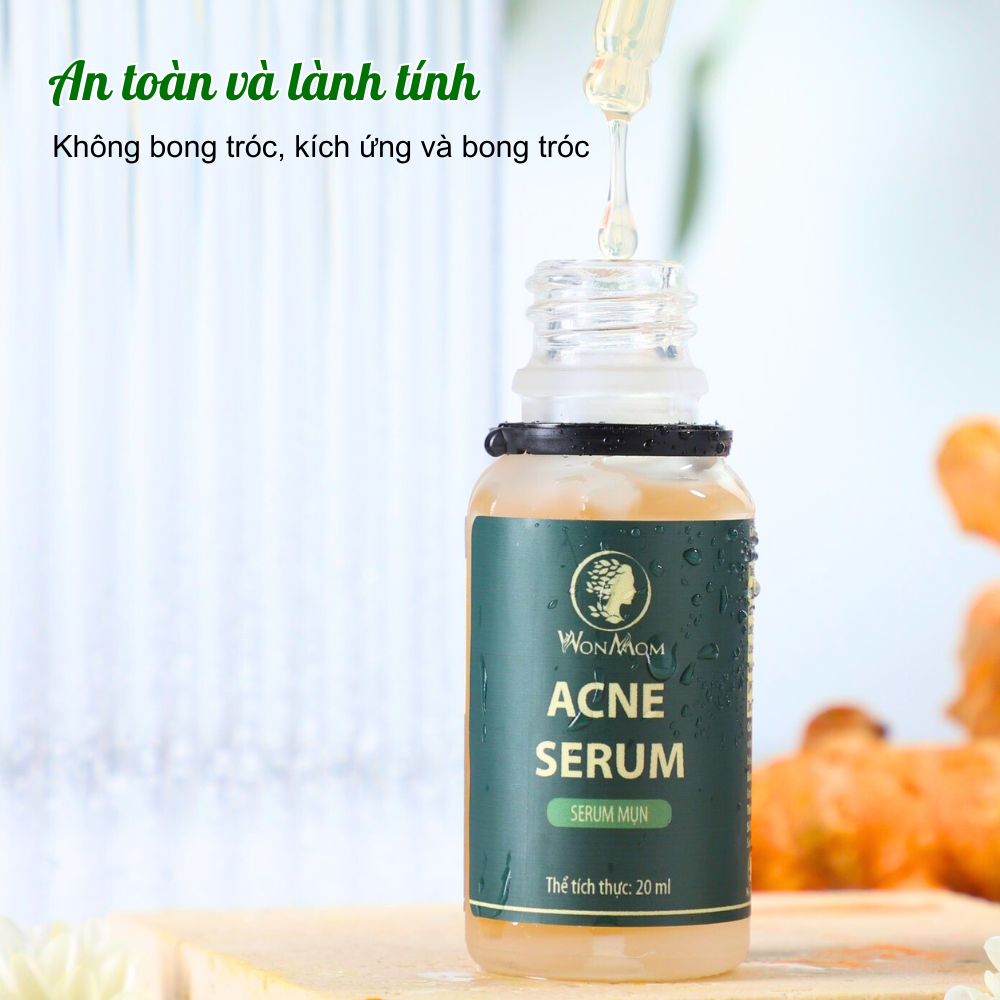 - Thành phần: Serum mụn Wonmom được làm từ những nguyên liệu tự nhiên: chiết xuất rau má, lộc đề, ZinC bum, vitamin B5. Kem cấp ẩm dưỡng da mụn Wonmom gồm những thành phần tự nhiên, an toàn: chiết xuất cam thảo, rau má, ZinC bum, vitamin B5, pentavitin, HA phân tử lớn nhỏ.