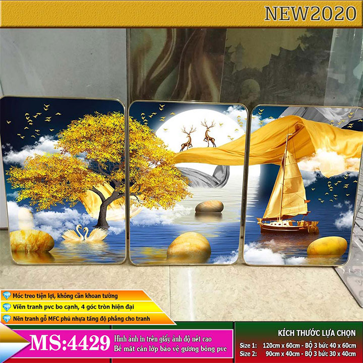 - Loại 2: Gồm 3 tấm 30 x 40cm - kích thước tổng thể 90cm x 40cm Móc treo tranh 4 đinh chuyên dụng giúp bạn dễ dàng lắp đặt. Các phụ kiện bổ trợ khác như ke sắt, vít, nút chống trượt mặt sau HƯỚNG DẪN TREO TRANH: CHẤT LIỆU, CẤU TẠO, CÔNG NGHỆ IN ẤN: Tranh gương PVC: tranh sẽ được in trên giấy ảnh sau đó bề mặt được cán nhiệt bằng một lớp bảo vệ PVC laminator chuyên dụng có tác dụng chống trầy sước, bám bụi, trong suốt và có tính chất phản quang, phản chiếu ánh sá