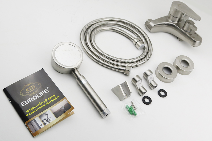 - Bộ sen được đi kèm bộ dây tay sen siêu tăng áp, 1 chế độ chảy Eurolife