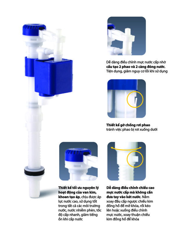- Dễ dàng điều chỉnh chiều cao mực nước cấp mà không cần đưa tay vao két nước ta chỉ cần nắm xoay đầu cấp ngược chiều kim đồng hồ để mở rồi kéo lên hoặc xuống điều chỉnh mực nước ,các giăng cao su chống lão hóa giúp tăng độ bền