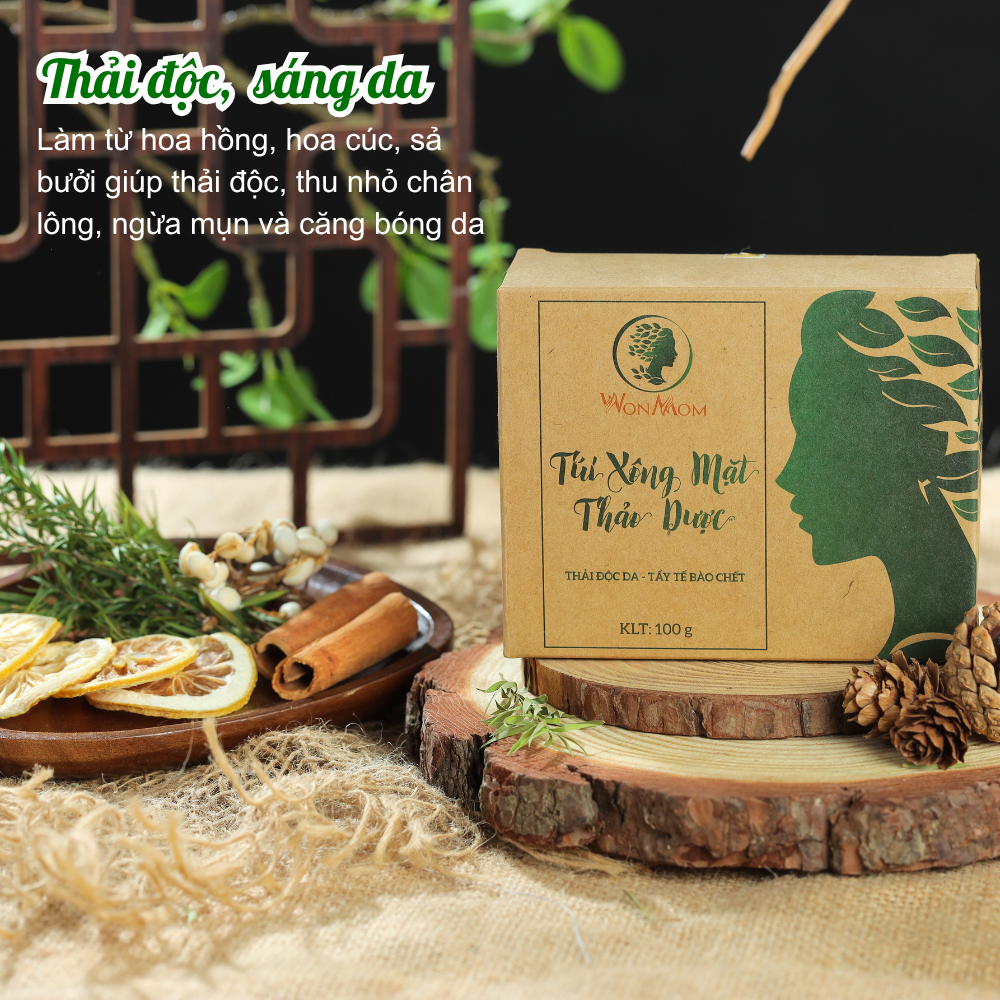 - Túi xông mặt thảo dược Wonmom với thành phần tự nhiên: Hoa hồng, bạch chỉ, tía tô, ngải cứu, bạc hà, sả, chanh và một số thảo dược khác.