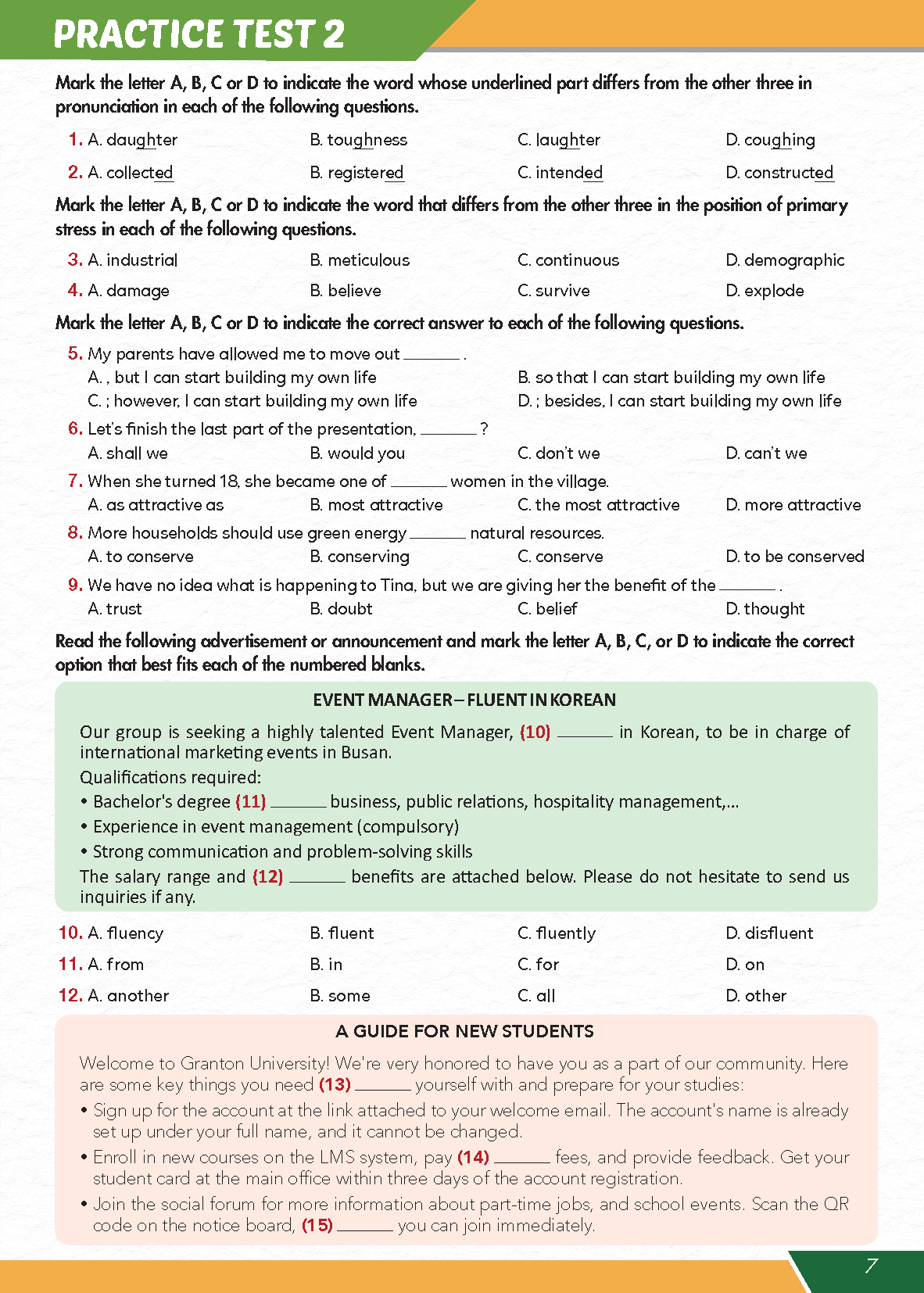 Practice Tests Grade 10 - 11 - 12 được biên soạn nhằm giúp học sinh củng cố kiến thức tiếng Anh lớp 10 và trang bị cho các em nguồn tài liệu luyện tập chuẩn
