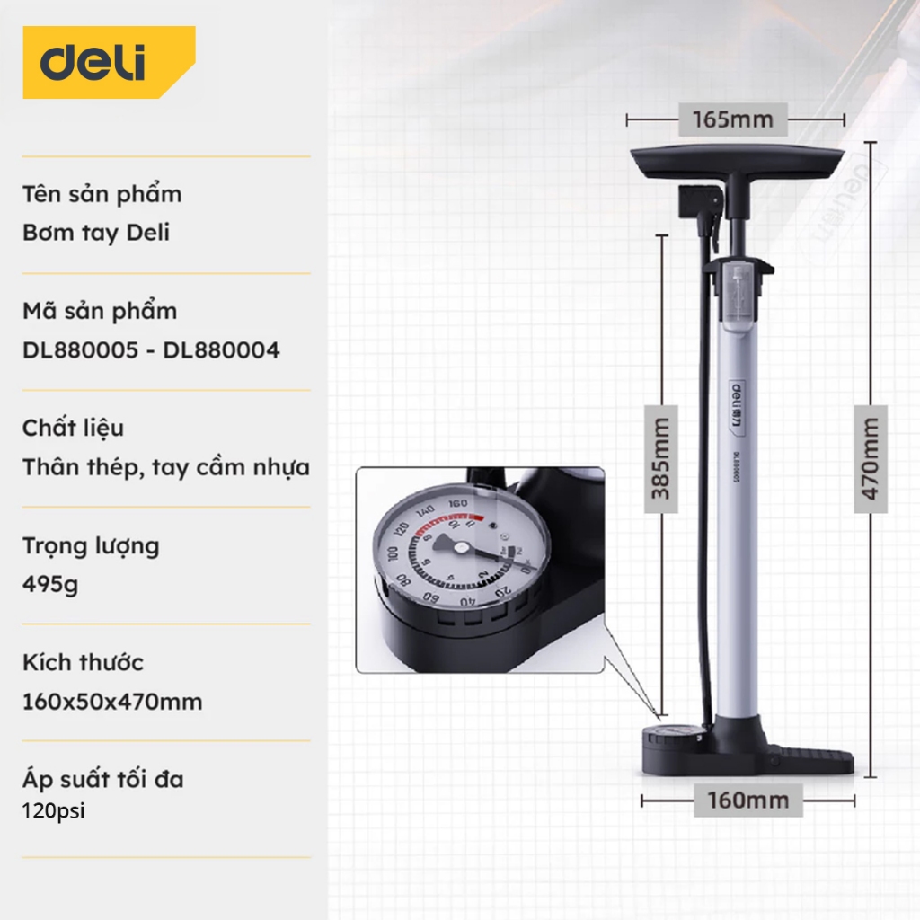 BƠM XE ĐẠP XE MÁY TÍCH HỢP ĐỒNG HỒ ÁP SUẤT DELI TOOLS THÔNG TIN SẢN PHẨM: Hãng sản xuất: Deli Tools Mã sản phẩm: DL880005 - DL880004 Áp suất đồng hồ đo được: