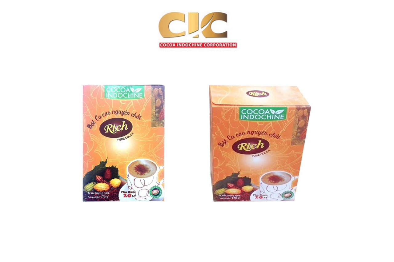 - Bột Cacao Hòa Tan Nguyên Chất Rich Cocoa Indochine (Hộp 170g) có mùi vị thơm ngon, giàu dinh dưỡng với thành phần bột Cacao thiên nhiên nguyên chất, không đường, giàu chất xơ giúp mang đến một thức