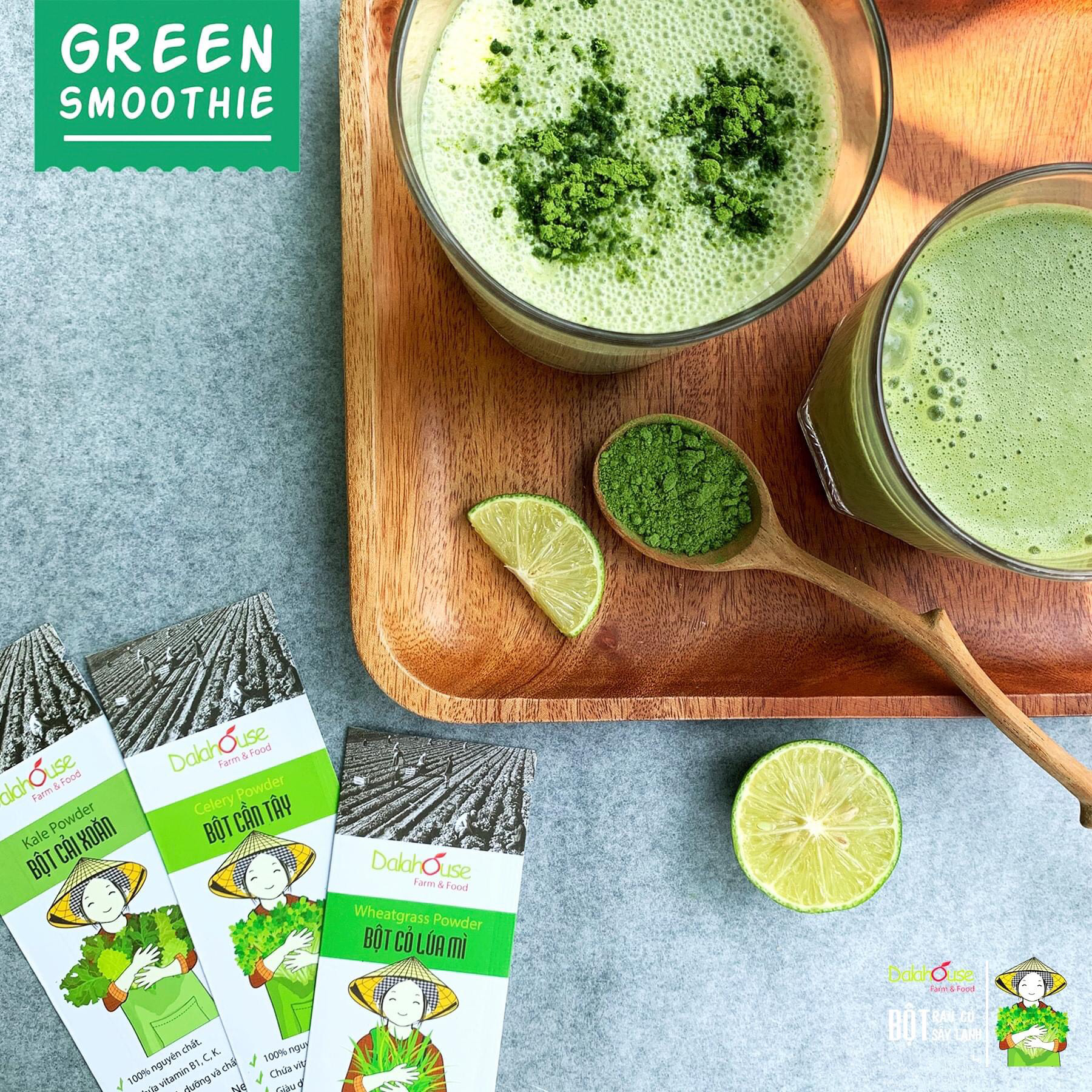 * Tên sản phẩm: Bột Cải Bó Xôi DalaHouse Sản xuất từ 100% cải bó xôi tươi được trồng và thu hoạch tại trang trại organic của Dalahouse tại Lâm Đồng. Công nghệ sấy lạnh
