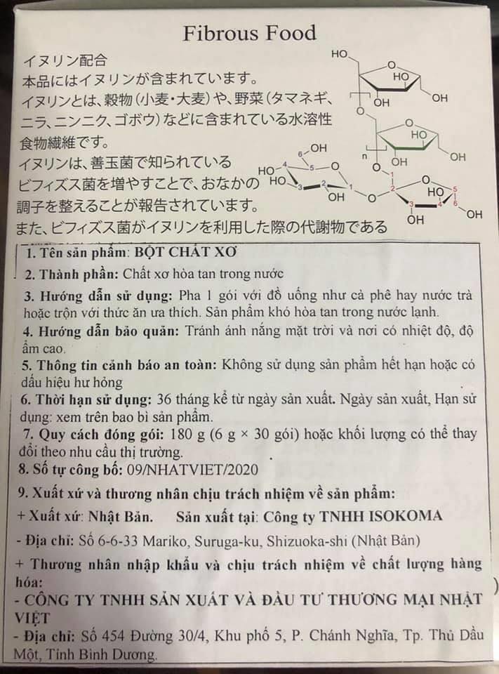- Giảm cân. Người thừa cân béo phì thường hay ăn nhiều, nhất là thực phẩm chứa nhiều dầu, mỡ. Vì vậy, năng lượng dư thừa tích tụ trong cơ thể gây ra tình trạng béo phì.Bột Chất Xơ ISOKOMA rất lý tưởng cho những người muốn giảm cân.Bột Chất Xơ làm cho ta no lâu, do đó giảm thèm ăn, phòng tránh được thừa cân béo phì. Hỗ trợ quá trình tiêu hóa, phòng ngừa táo bón. Khi vào ruột chất xơ có thể hút nhiều nước, làm tăng khối lượng của phân và kích thích nhu động ruột làm tăng co bóp để tống phân ra ngoài. Từ đó, giúp đại tiện đều đặn hàng ngày, cơ thể thải chất độc thường xuyên và tránh việc ngấm chất độc từ phân vào máu. Bột Chất Xơ giúp điều hòa hệ vi khuẩn đường ruột: Một số loại vi khuẩn sống tại ruột có khả năng phân giải và đồng hóa chất xơ. Bột Chất Xơ tạo điều kiện hỗ trợ sự phát triển vi khuẩn có lợi. Nhờ có tác dụng điều hòa hệ vi khuẩn tại ruột nên chất xơ còn có vai trò giúp tăng cường quá trình tiêu hóa hấp thu tại ruột. Làm giảm lượng cholesterol trong máu: Việc tổng hợp muối mật được thực hiện tại gan với nguyên liệu là cholesterol, sau đó muối mật được đổ vào ruột non qua ống mật chủ. Tại ruột, chất xơ hút nước sẽ nở ra giúp giữ muối mật trong các lớp nhầy rồi đẩy theo phân ra ngoài do đó làm giảm sự hấp thu lại muối mật. Vì vậy khẩu phần ăn nhiều chất xơ sẽ giúp làm giảm lượng cholesterol trong máu. *Chất xơ với bệnh tim mạch. Cholesterol tăng cao trong máu là nguyên nhân gây một số bệnh tim mạch. Chất xơ giúp làm giảm cholesterol bằng cách làm giảm chất béo LDL và tăng HDL, từ đó giảm thiểu nguy cơ các bệnh tim mạch như mỡ máu, bệnh mạch vành, xơ vữa động mạch. Sản phẩm Bột Chất Xơ ISOKOMA đáp ứng được các nhu cầu đó.hộp 30 gói ( 6g/gói) Sản phẩm không phải là thuốc không có tác dụng chữa bệnh.