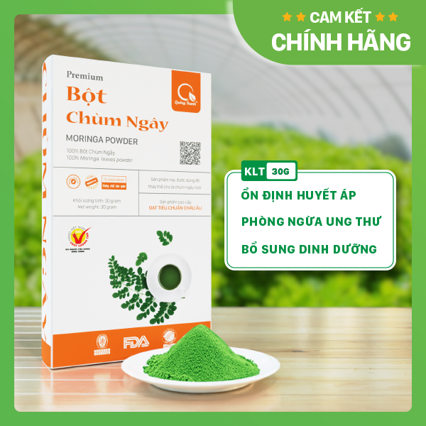 - Mua hàng 1 lần, chăm sóc khách hàng trọn đời. CÔNG DỤNG BỘT CHÙM NGÂY QUẢNG THANH Bột chùm ngây dùng thay thế cho chùm ngây tươi Bổ sung dinh dưỡng trợ ổn định đường huyết Hỗ trợ cải thiện các vấn đề về xương khớp Hỗ trợ cải thiện sức khỏe tim mạch NHỮNG LÝ DO BẠN KHÔNG THỂ BỎ QUA BỘT CHÙM NGÂY QUẢNG THANH Nguyên liệu có nguồn gốc rõ ràng: Chùm ngây được canh tác và thu hoạch từ trang trại sinh học, đảm bảo sự an toàn và sự tươi ngon cho người dùng. Nguyên chất 100% - Dinh dưỡng trọn vẹn: Bột chùm ngây Quảng Thanh được sản xuất 100% từ lá chùm ngây tươi, không chứa phụ gia, chất bảo quản. Bạn sẽ được sử dụng bột chùm ngây thơm ngon, dồi dào dinh dưỡng và đậm đà hương vị nguyên bản. An toàn - Chất lượng: Bạn sẽ không lo ngại vấn đề nhiễm vi khuẩn gây hại và giun sán do sản phẩm được kiểm soát chặt chẽ với nhiều chứng nhận FDA, ISO 22000:2018, HACCP, Hàng Việt Nam chất lượng cao, Tiện lợi - Nhanh chóng: Bạn sẽ không cần tốn quá nhiều thời gian và công sức để mua chùm ngây - nhặt - rửa và ép lấy nước uống. Với bột chùm ngây, bạn đã tiết kiệm được 1 khối thời gian vì việc pha chế rất đơn giản. Bạn còn có thể sử dụng chùm ngây tươi bất kỳ lúc nào trong bất kỳ không gian nào theo cách mà bạn muốn. LƯU Ý SỬ DỤNG BỘT CHÙM NGÂY