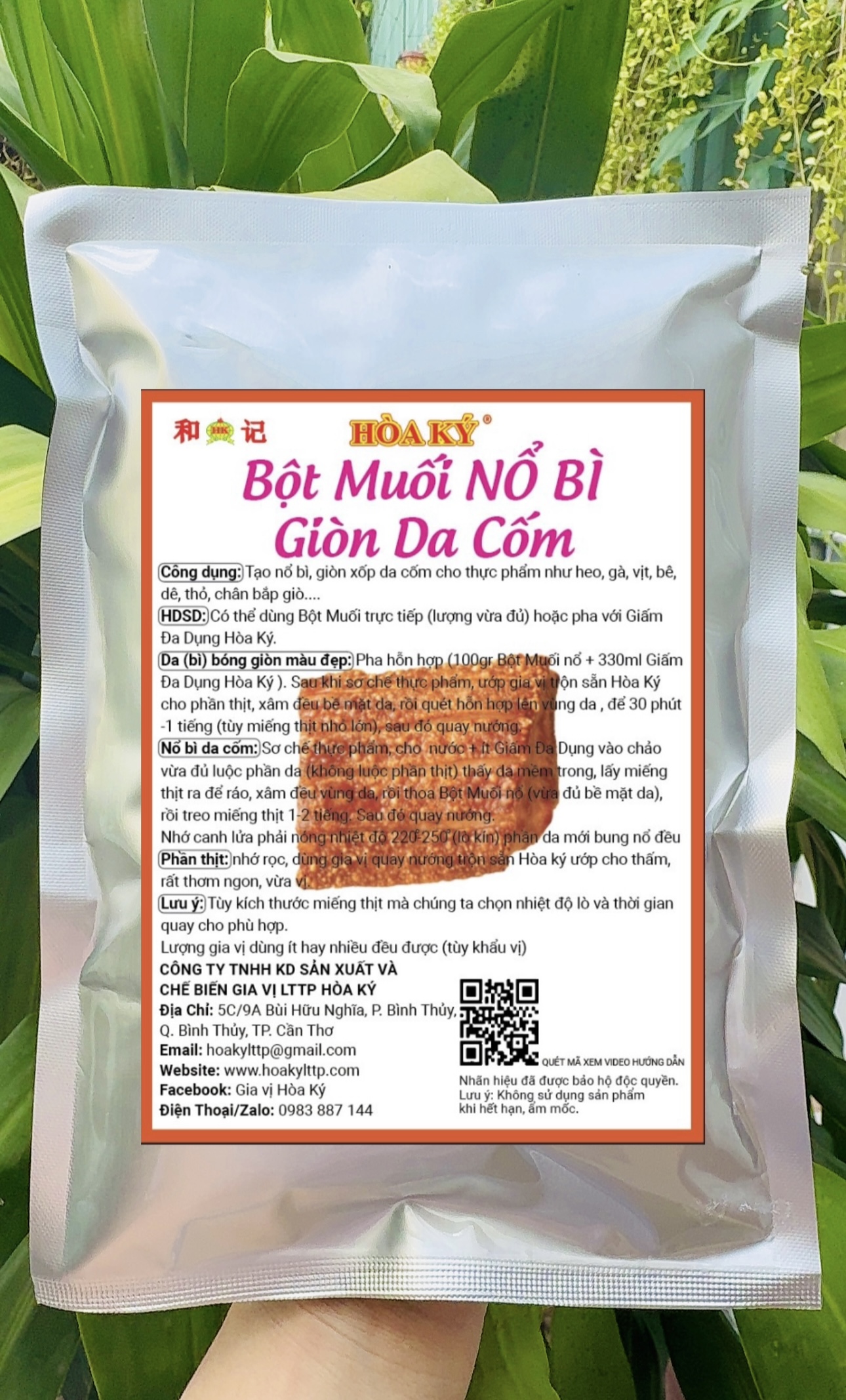 BỘT NỔ BÌ GIÒN DA CỐM Combo quay nướng đầy đủ gia vị, không cần nêm thêm. Gồm có : Bột nổ bì giòn da cốm Gia vị trộn sẵn ướp phần thịt Giấm (Dấm) đa dụng tạo màu đẹp ,da giòn . Thực phẩm : cho Heo, gà,  vịt , bê,dê, thỏ, chân giò, chim bồ câu ….tạo nổ giòn xốp da cốm, thịt thấm vừa ăn thơm ngon .   Công dụng của Bột : Tạo nổ giòn xốp da cốm cho Heo, gà,  vịt , bê,dê, thỏ, chân giò.... HDSD : Dùng Bột trực tiếp lên da để nổ bì da . Quay da bóng giòn màu đẹp thì lấy  Bột  nổ pha với  Giấm Đa Dụng Hòa Ký ; xâm đều bề mặt da, rồi quét đều vùng da cần nổ giòn, để 1– 2 tiếng hong gió ( tùy miếng thịt nhỏ lớn), sau đó quay nướng. Lưu Ý : Tùy kích thước miếng thịt mà chúng ta chọn nhiệt độ lò và thời gian quay cho phù hợp .   HEO miếng:  làm sạch miếng thịt heo. Rồi cho (ít nước + ít Giấm Đa Dụng ) vào chảo vừa đủ luộc phần da  miếng thịt (không luộc phần thịt) thấy da mềm trong là lấy ra để ráo, xâm đều vùng da. Sau đó thoa Bột Nổ (vừa đủ) trực tiếp lên phần da ,hong gió 1– 2tiếng, rồi mới quay nướng. Phần thịt,nhớ rọc, dùng Gia Vị quay nướng trộn sẵn ướp cho thấm, rất thơm ngon.   Dùng gia vị ít hay nhiều đều được ( tuỳ khẩu vị) . Dùng được cho món Chay.
