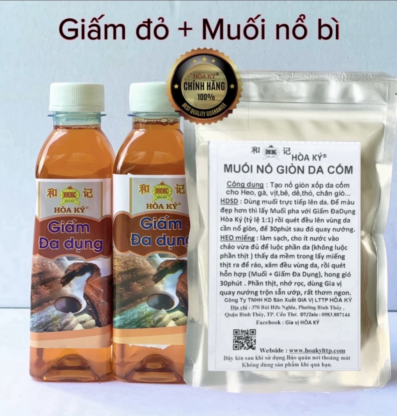 - Ướp phần thịt trong bụng: 1kg thực phẩm = 30gr Gia Vị trộn sẵn ( ít nhiều tuỳ khẩu vị ) + 30gr củ tỏi đập dập hoặc 1 muỗng cà phê Bột Tỏi Hoà Ký + 30gr đầu hành lá đập dập + 1 muỗng cà phê Dầu Mè Hoà Ký. Nhớ rọc thịt, trộn đều tất cả rồi ướp. Để 3-6 tiếng đồng hồ cho thấm. Nếu gấp tăng gia vị thêm và để 1 tiếng đồng hồ cho thấm vào thực phẩm. ( Ướp Vịt thêm 1 muỗng canh tương hột xay ,nấm mèo, nấm kim châẽ rất ngon ). *Xử lý phần da : Sau khi thực phẩm đã thấm gia vị. Heo miếng nhớ xâm da . Lấy Giấm Đa Dụng nguyên chất quét đều lên da hoặc cho vào bình xịt đều ,phủ hết phần da ,rồi treo hong gió 1-2tiếng . Chuẩn bị lò bắt đầu quay nướng. Thịt đã chín, quét 1 ít Dầu Mè Hoà Ký lên da cho bóng thơm. sản phẩm của Công Ty HOÀ KÝ HSD: 12 tháng Xuất xứ : Việt Nam