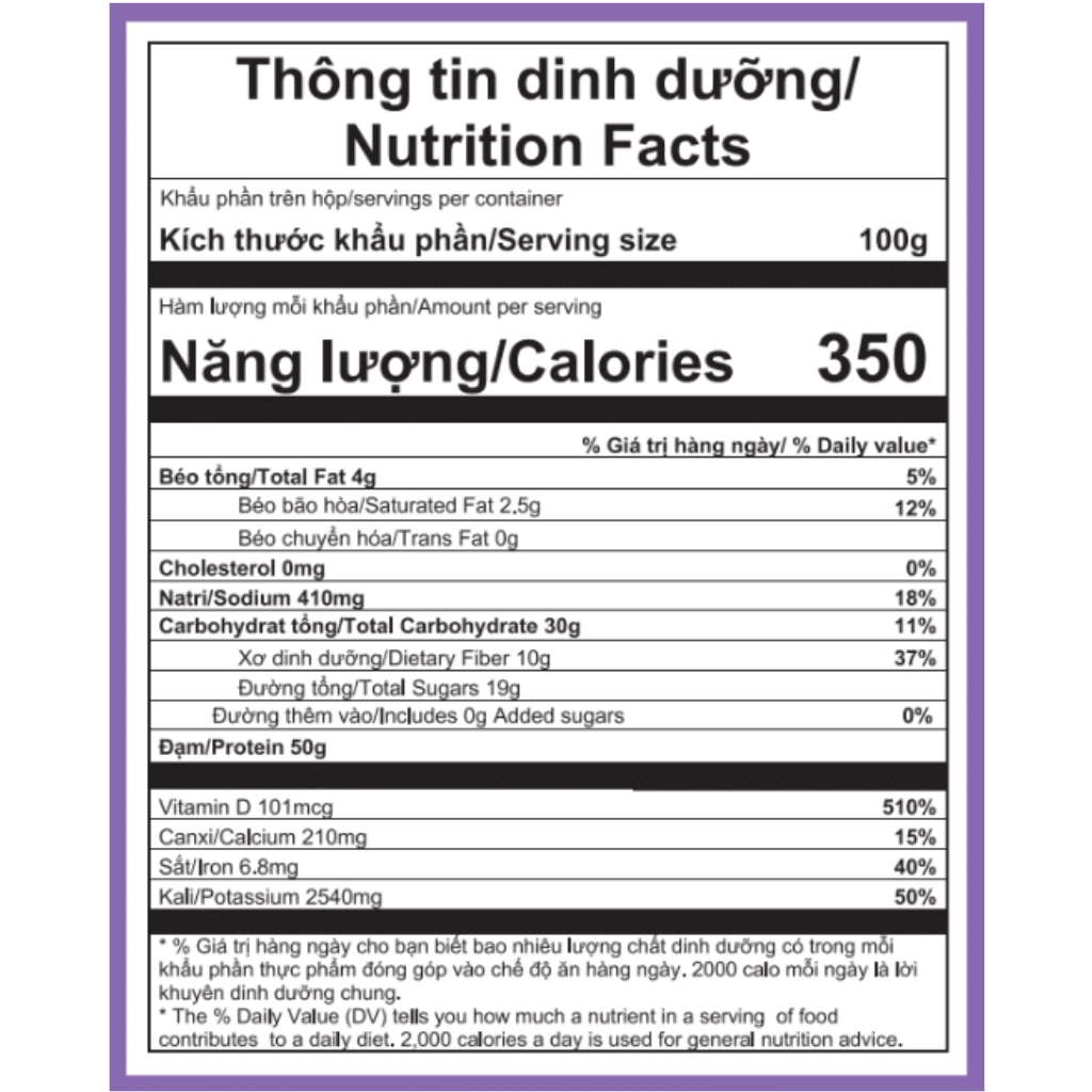 Thành Phần: Hạt sen, Hoài sơn, Kỷ tử, Khiếm thực, Đậu nành, Gạo, Ngô, Bột Kem, Bắp, Sữa bột gầy, Đường Isomalt, Đường ăn kiêng. * Công dụng: Bột ngũ cốc ăn kiêng Việt đài