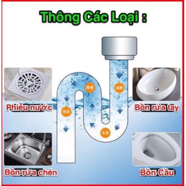 - Bột thông bồn cầu là sản phẩm có khả năng đánh tan mọi chất cặn bẩn bám mắc lâu ngày trong đường ống của bếp, chậu rửa , cống nước thải .... Đặc biệt đánh tan những loại cứng đầu nhất như dẻ, tóc, giấy.,giàu mỡ ..