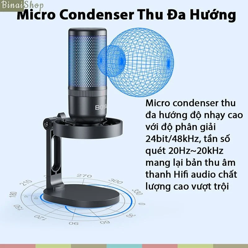 - Micro condenser thu đa hướng độ nhạy cao, độ phân giải 24bit/48kHz, tần số quét 20Hz~20kHz mang lại bản thu âm thanh Hifi audio chất lượng cao vượt trội.