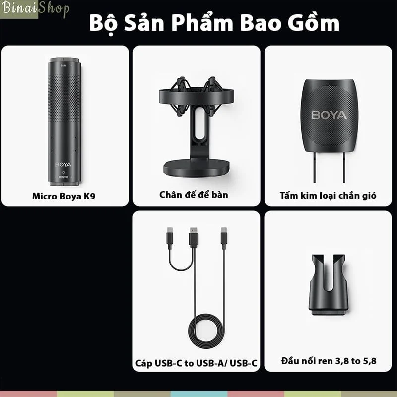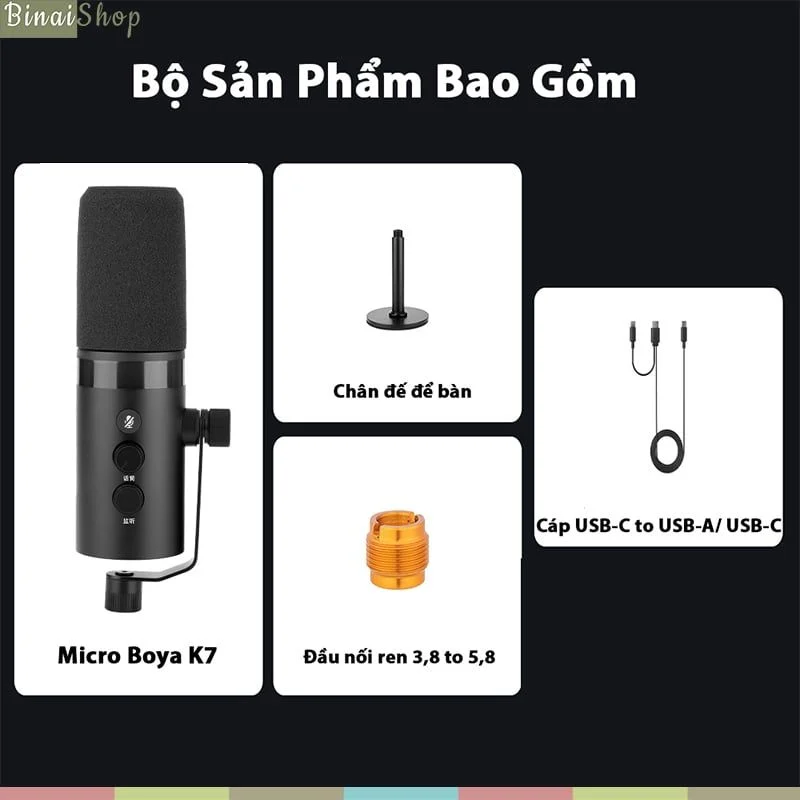 - Trang bị hai lựa chọn gắn micro với chân đế để bàn chống trượt độ bám tốt chống rung hiệu quả với mọi tác động của môi trường và giá đỡ để bàn. BỘ SẢN PHẨM BAO GỒM 01 Micro Boya K301 Micro Boya K701 Micro Boya K901 Cáp Type-C to USB-A/ USB-C01 Cáp USB-C to USB-A/ USB-C01 Cáp USB-C to USB-A/ USB-C01 Chân đế để bàn01 Đầu nối ren 3,8 to 5,801 Chân đế để bàn01 Đầu nối ren 3,8 to 5,801 Chân đế để bàn01 Đầu nối ren 3,8 to 5,801 Tấm kim loại chắn gió01 Sách hướng dẫn01 Tấm kim loại chắn gió01 Sách hướng dẫn 01 Sách hướng dẫn THÔNG SỐ KỸ THUẬT ModelBoya K3Boya K7Boya K9Acoustic PrincipleCondenser MicrophoneCondenser MicrophoneCondenser MicrophonePickup PatternSuper CardioidSuper CardioidOmnidirectional/time-lapse/figure-8Frequency Response20Hz~20kHz50Hz~20kHz20Hz~20kHzSensitivity (maximum gain)-11dBFS at 80dBSPL-10dBFS ở mức 78dBSPL-10dBFS ở 80dBSPLSensitivity (minimum gain)-39dBFS ở 80dBSPL-46dBFS ở 80dBSPL-46dBFS ở 78dBSPLSampling Rate48kHz48kHz48kHzBit Depth16/24Bit16/24Bit16/24BitSignal-to-Noise Ratio75dB>80dB75dBMaximum Sound Pressure Level (maximum gain)105dBSPL75dBSPL108dBSPLMinimum Output Impedance16Ω16Ω16ΩInterface Type3.5mm headphone jack; USB-C output interface (High-speed USB2.0)3.5mm monitoring headphone jack; USB-C output interface (USB2.0 high speed); 3-pin XLR auxiliary output interface3.5mm headphone jack; USB-C output interface (High-speed USB2.0)Size (with stand)86117249mm83x222mm 86x177x249mmWeightAbout 415gAbout 350gAbout 599gPower requirements5V, maximum, 200mA 5V, maximum, 200mACompatible systemsWindows: 10.0 or later; macOS: 10.15 or later; Android: 9.0 or later; iPadOS: 14 or later (Requires Apple devices that support USB-C)Windows: 10.0 or later; macOS: 10.15 or later; Android: 9.0 or later; iPadOS: 14 or later (Requires Apple devices that support USB-C)Windows: 10.0 or later; macOS: 10.15 or later; Android: 9.0 or later; iPadOS: 14 or later (Requires Apple devices that support USB-C)Operating temperature0℃ ~ +40℃0℃ ~ +50℃0℃ ~ +40℃Storage temperature-20℃ ~ +70℃; 10 to 95%, non-condensing-10℃ ~+50℃-20℃ ~ +70℃ (-4°F ~ 158°F); 10~95%, non-condensing Keyword: Boya k3, boya k7, boya k9, micro usb, micro thu âm cho máy tính, micro thu âm điện thoại, micro cổng Type-C, micro condenser, micro thu âm giá rẻ