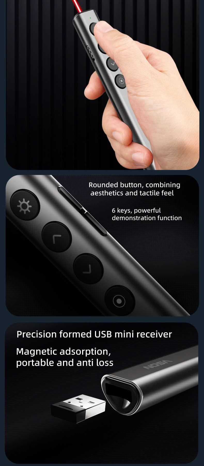 Bút Trình Chiếu Không Dây kiêm Chuột Bay VSON N81 – Tích Hợp Laser & Nhiều Tính Năng Hỗ Trợ Mô tả sản phẩm: Thiết bị trình chiếu đa năng VSON N81 tích hợp cả
