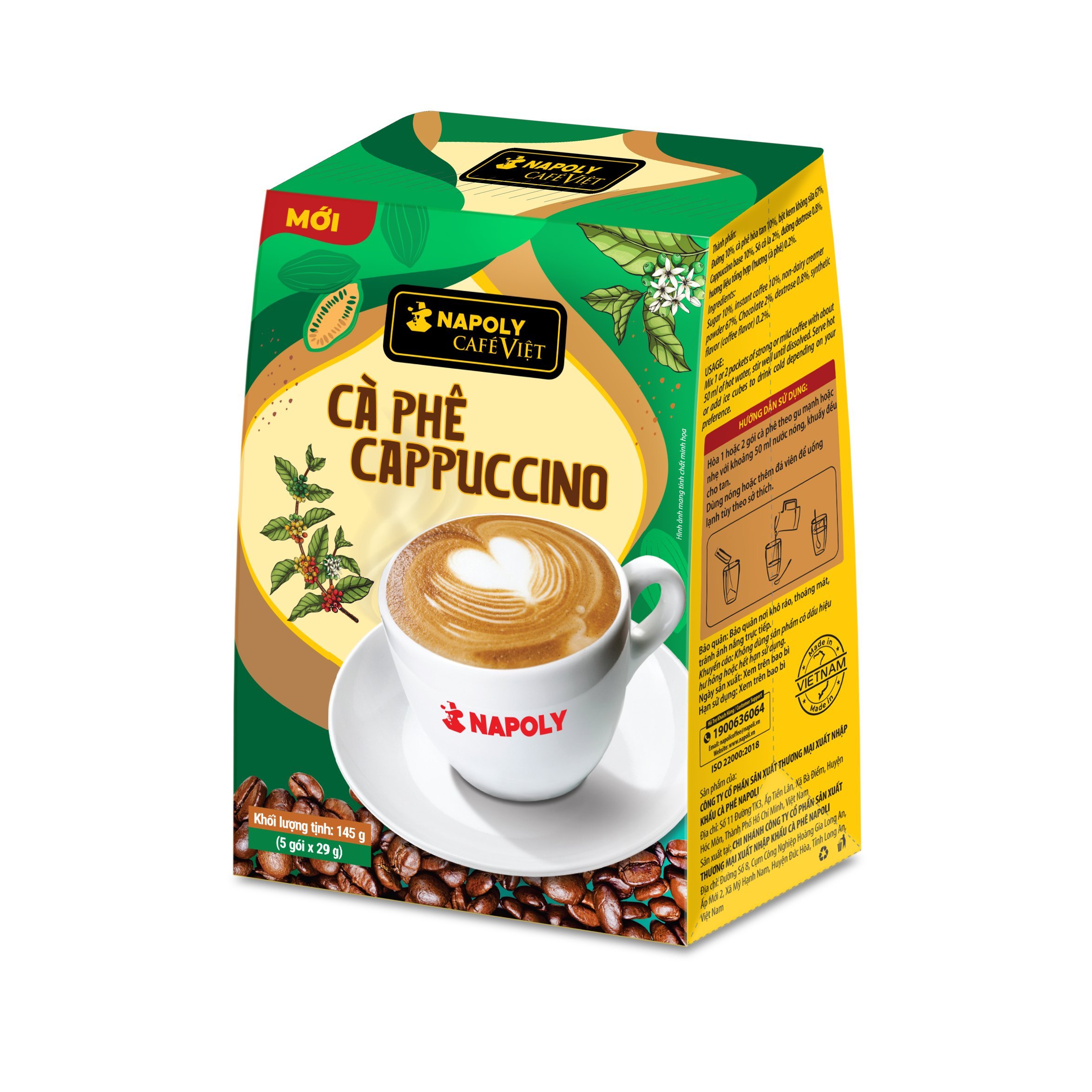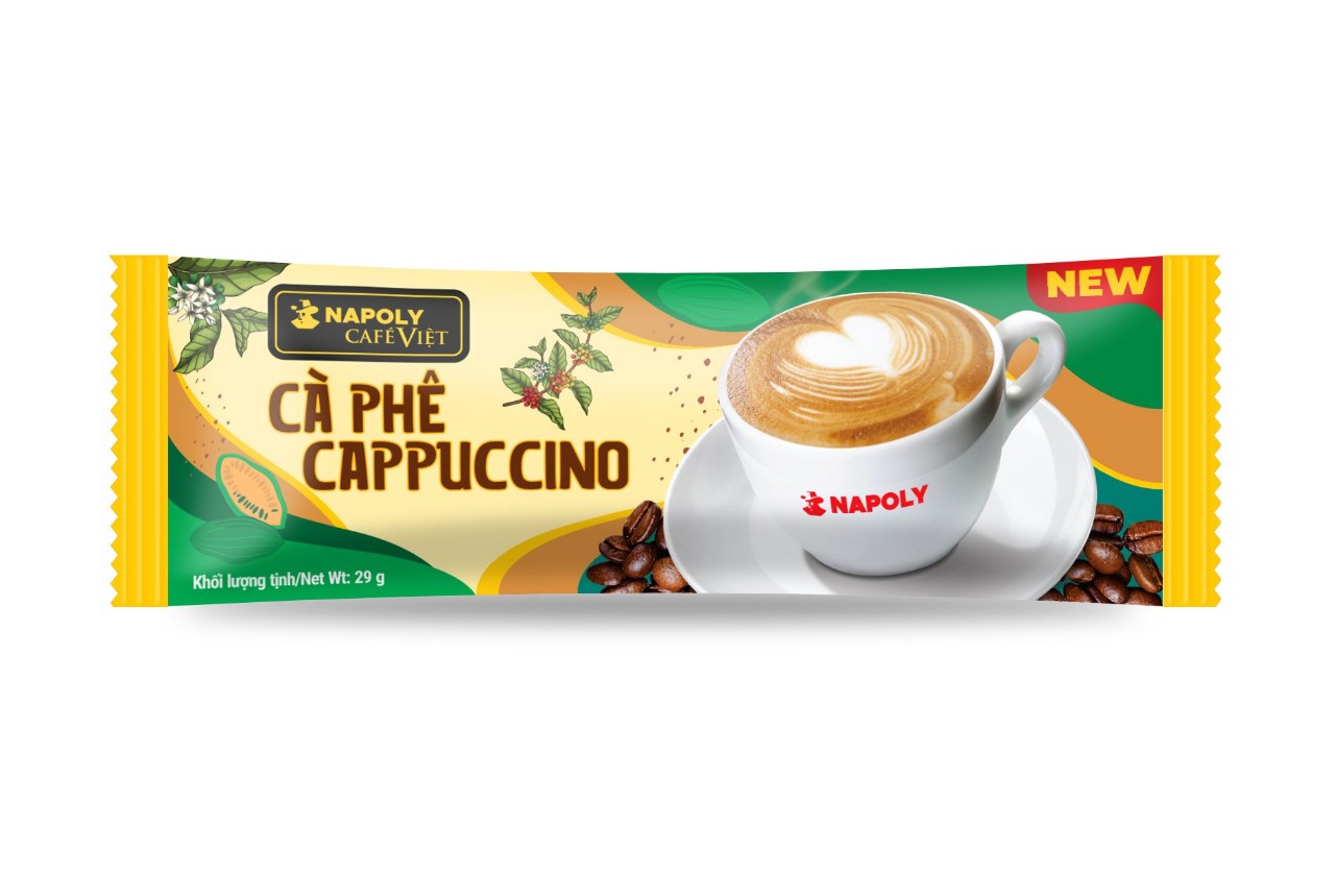 Hộp nhỏ cà phê sữa hòa tan Cappuccino đậm vị cà phê, sữa ngọt ngào, Socola béo ngậy thơm lừng Napoly Coffee (5gói x 29g) NAPOLI – CÀ PHÊ VIỆT – ĐẬM GU ĐÚNG CHẤT • CÀ PHÊ SẠCH: