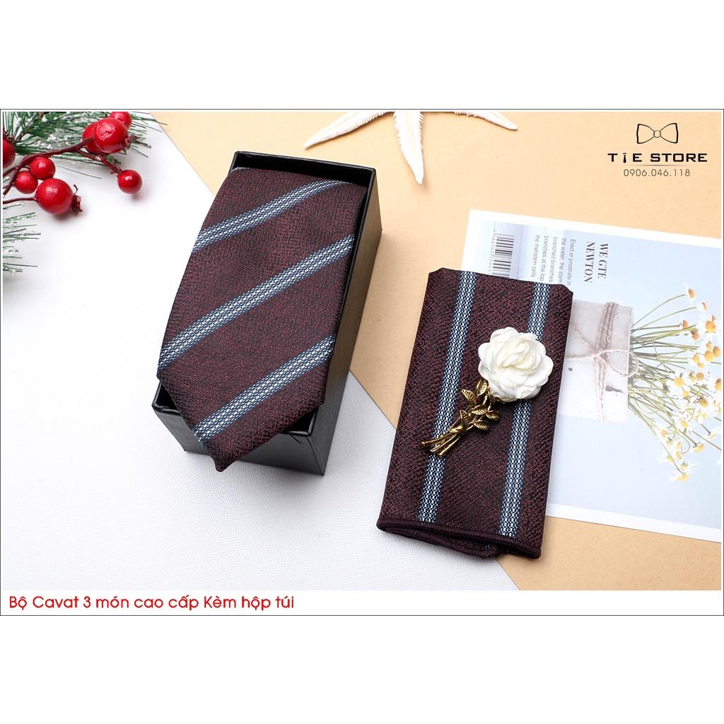 ✨Ca Vat bộ 3 món kèm hộp túi xách cao cấp, quà tặng chú rể, Cavat nâu đỏ kẻ
