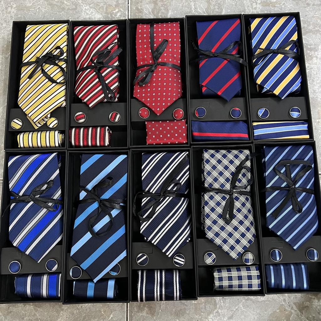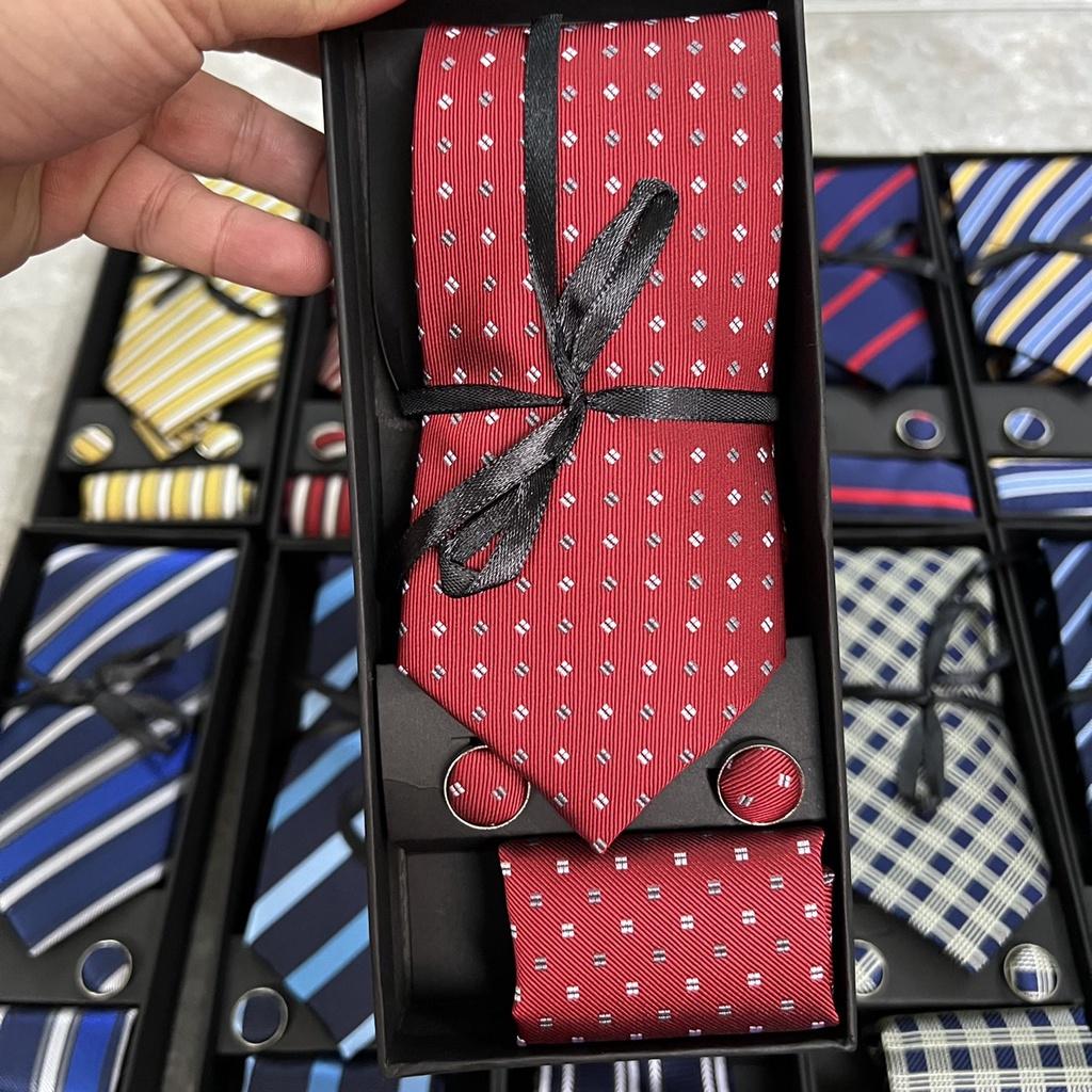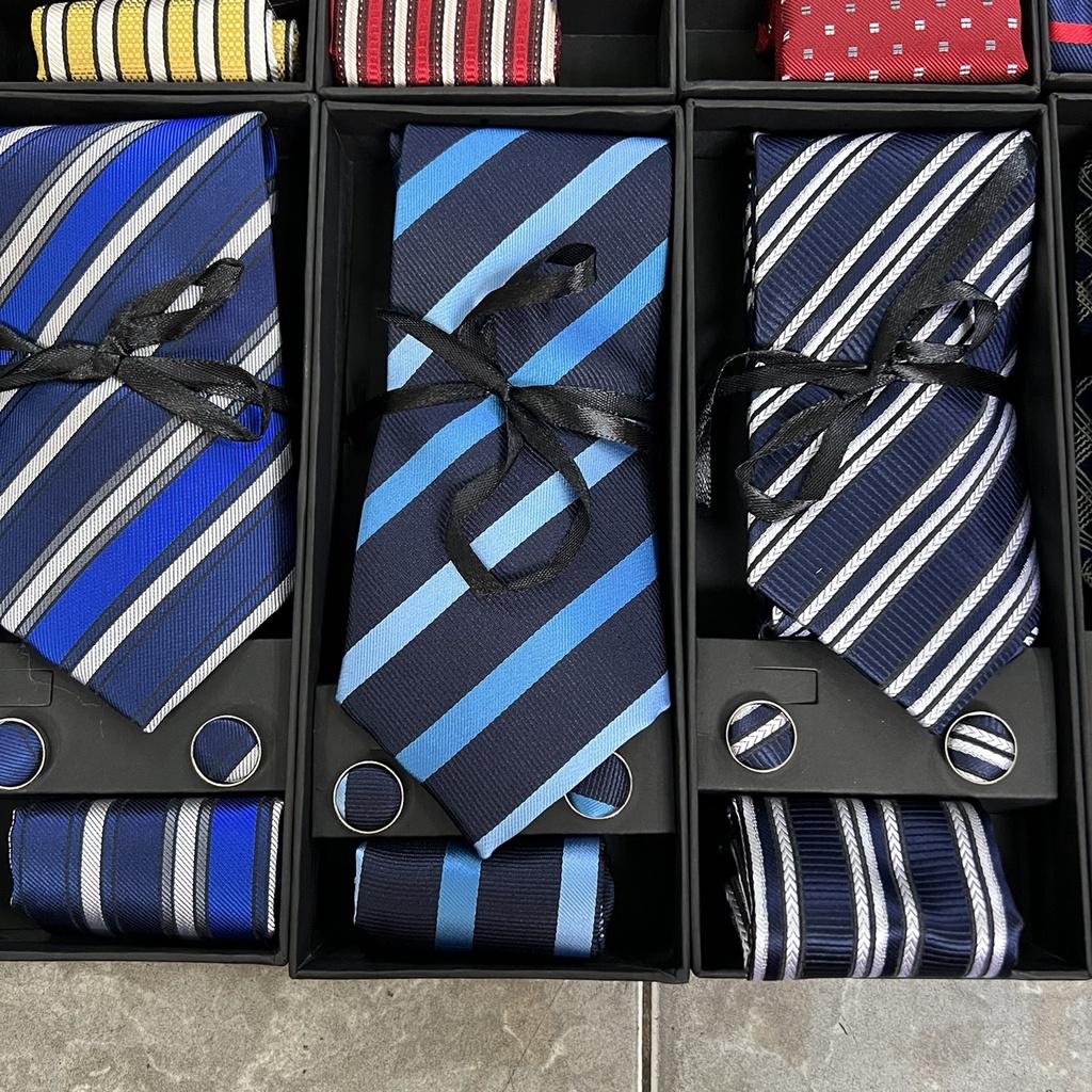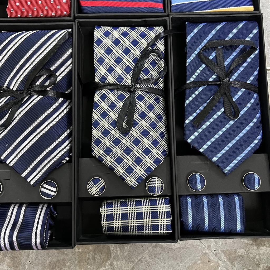 Hộp quà tặng gồm 1 cà vạt nam 8cm kích cỡ chuẩn 8cmx150 k. 1 hộp đựng cà vạt , 01 Khăn túi áo véc 20x20 cm , 1 cặp khuy áo măng sét cũng