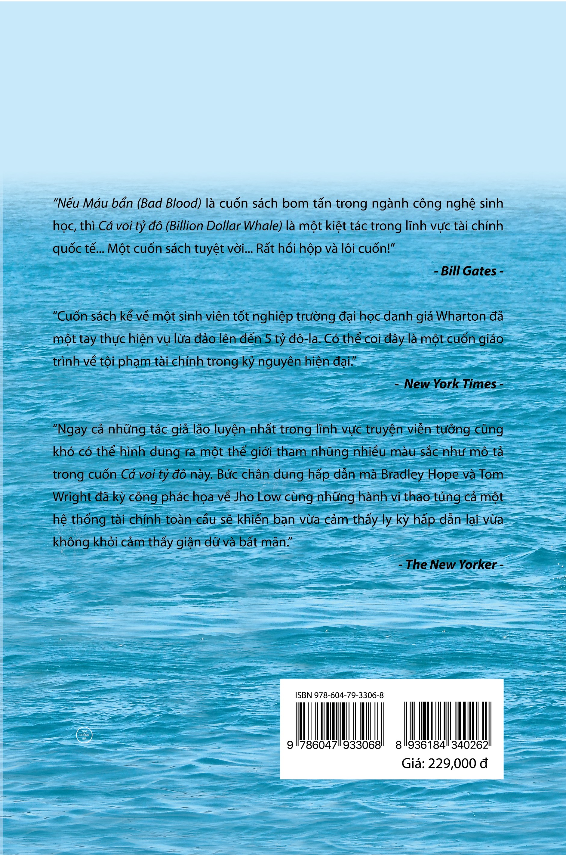“Nếu Máu bẩn (Bad Blood) là cuốn sách bom tấn trong ngành công nghệ sinh học, thì Cá voi tỷ đô (Billion Dollar Whale) là một kiệt tác trong lĩnh vực tài chính quốc tế Một cuốn sách tuyệt vờ Rất hồi hộp và lôi cuốn!” – Bill Gates