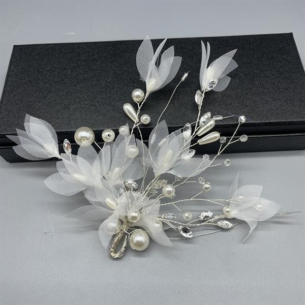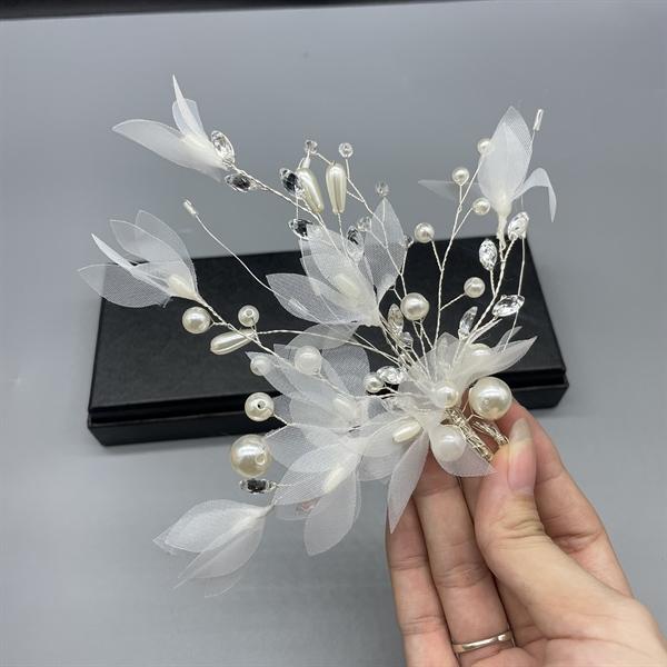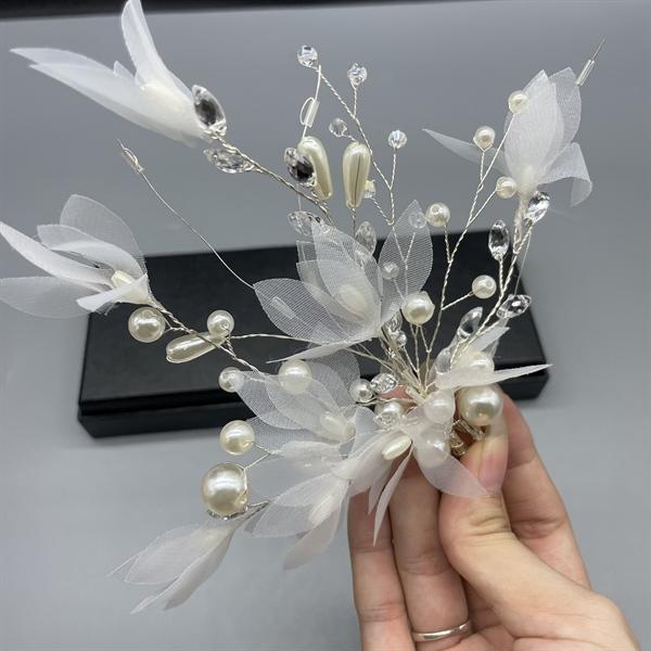 Trâm cài tóc cô dâu thiết kế ngọc trai và hoa 5 canh mềm mại, nữ tính. Tôn lên vẻ đẹp cho mái tóc xinh. Thích hợp trang điểm, make up cô dâu, trang điểm