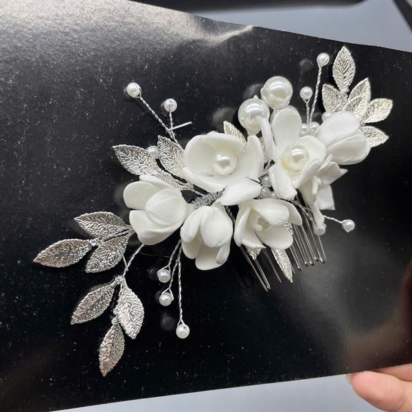 Trâm cài tóc cô dâu thiết kế ngọc trai và hoa 5 canh mềm mại, nữ tính. Tôn lên vẻ đẹp cho mái tóc xinh. Thích hợp trang điểm, make up cô dâu, trang điểm